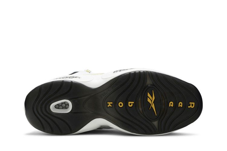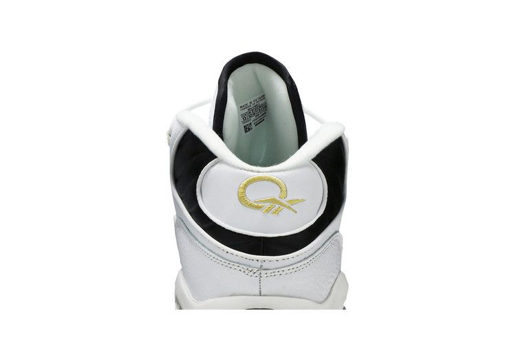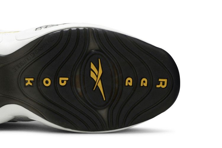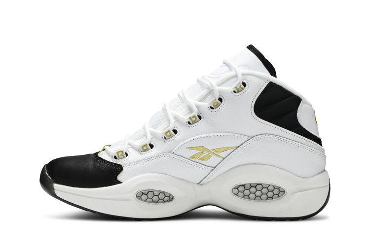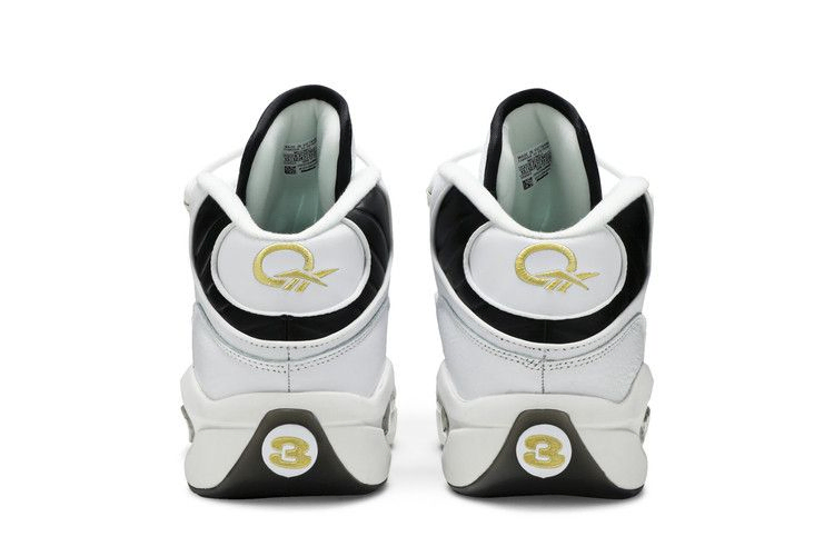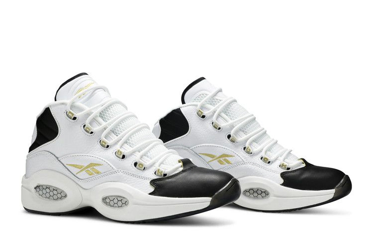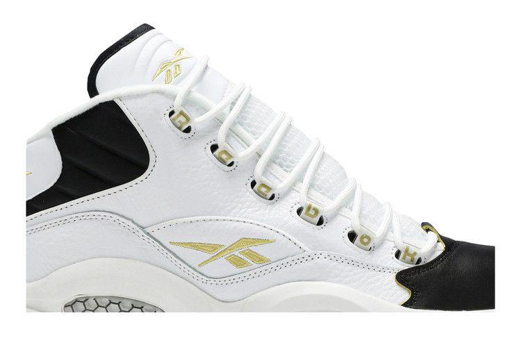 Модель Question Mid 'Respect My Shine' представляет фирменную обувь Аллена Айверсона в простом двухцветном дизайне с позолоченными деталями. Верхняя часть кроссовок изготовлена из белой кожи, украшенной черной мягкой подкладкой и черной обводкой носка. Золотисто-металлическая вышивка использована на различных элементах брендинга, включая логотип Reebok Vector на задней панели. Все это располагается на промежуточной подошве EVA с видимой амортизацией Hexalite.