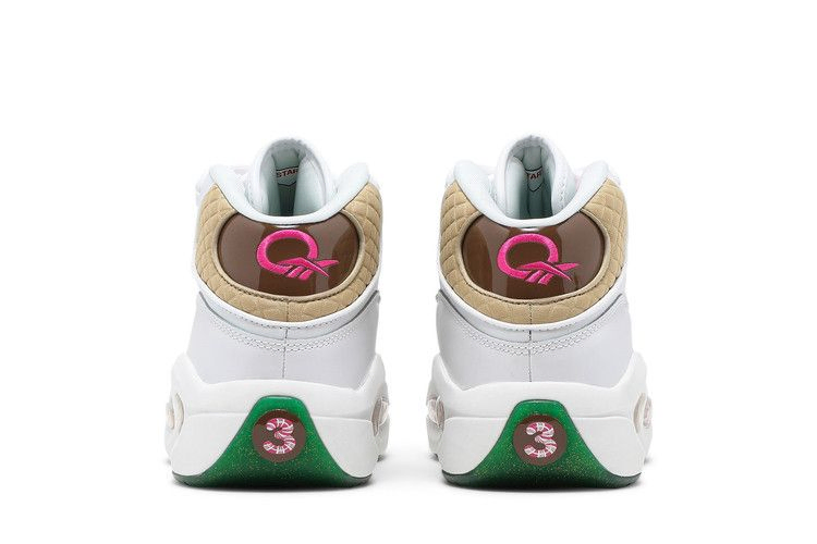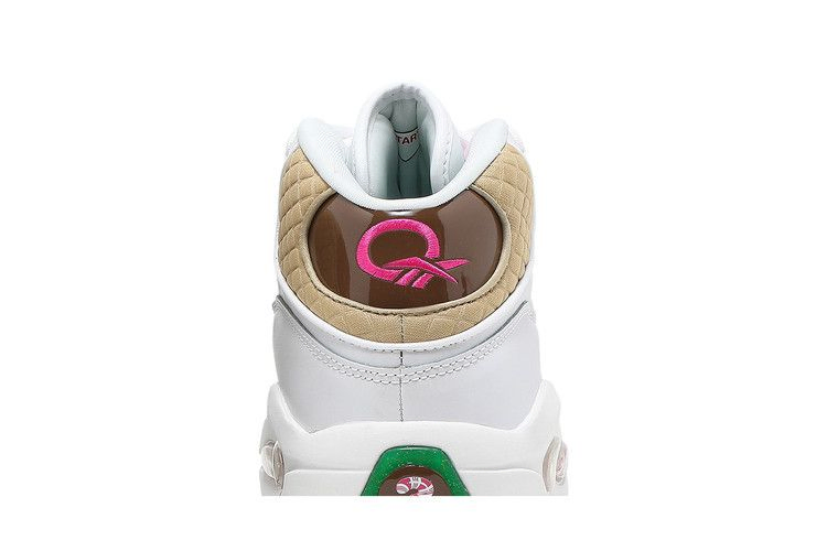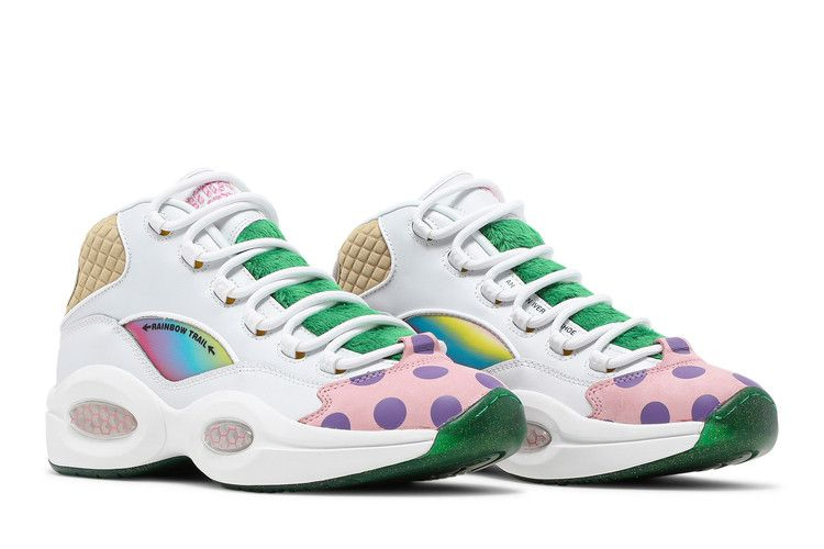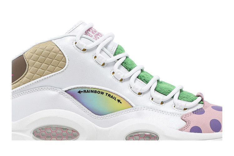 Выпущенная в рамках ретро-коллекции, вдохновленной классической настольной игрой Hasbro, модель Reebok Question Mid "Candy Land" украшает дебютную фирменную обувь Аллена Айверсона уникальными текстурами и красочными принтами. Верхняя часть мид-топа выполнена из белой кожи с носочной частью в горошек и призматическими панелями, которые указывают путь к радужной тропе. Мягкие стеганые детали украшают воротник, а травянисто-зеленый текстиль покрывает язычок. На язычок нанесен розовый логотип Candy Land, совпадающий с вышитым логотипом Question на язычке.