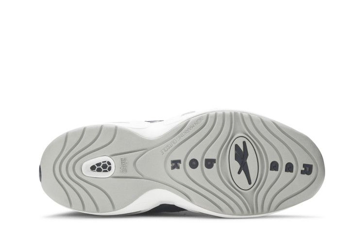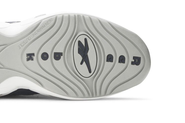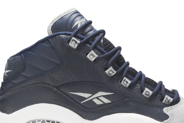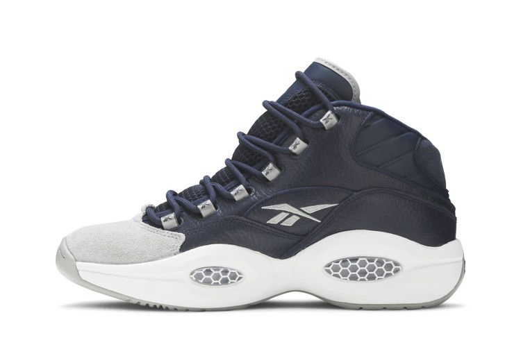 Question Mid 'Georgetown' возвращает дебютные фирменные кроссовки Аллена Айверсона в знакомой цветовой гамме, которая отсылает к альма-матер спортсмена. Верхняя часть кроссовок выполнена из галтованной кожи цвета Faux Indigo и дополнена элементами брендинга и замшевой крышкой носка нейтрального серого цвета. Верх кроссовок опирается на белую подошву из пеноматериала, оснащенную системой амортизации Hexalite от Reebok, которая обеспечивает высокую чувствительность при движении по асфальту.