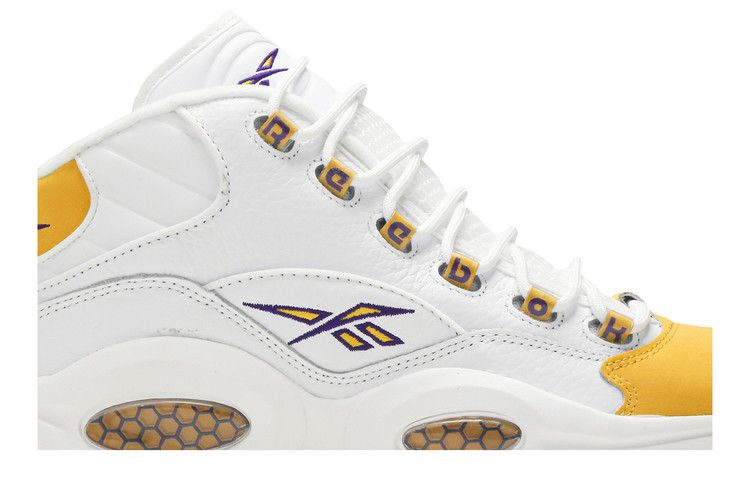 Модель Reebok Question Mid "Yellow Toe" вдохновлена расцветкой PE, которую Коби Брайант носил в команде Los Angeles Lakers во время сезона НБА 2002-2003 годов, который запомнился спортсмену как год свободной торговли кроссовками. Дебютная фирменная обувь Аллена Айверсона получила белый кожаный верх с контрастными желтыми вставками на люверсах, мыске и пятке. На пятке расположен логотип Question с фиолетовой вышивкой, а на язычке и четвертьпанели - фирменный знак Reebok Vector.