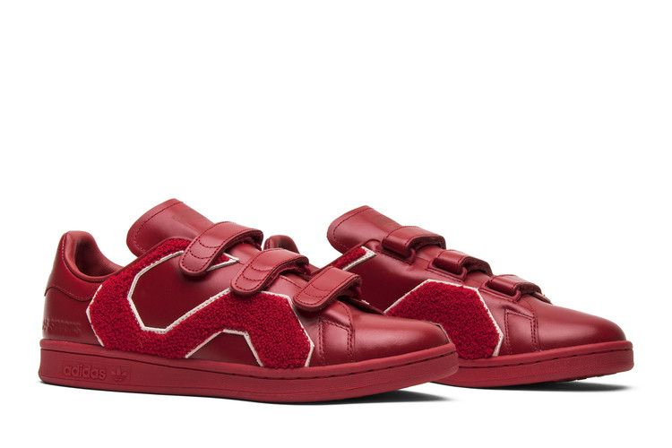 Раф Симонс переосмыслил модель Stan Smith Comfort Badge "Power Red". Отказавшись от традиционной системы шнуровки и заменив ее на липучку, Раф Симонс украсил кроссовки большими синельными нашивками на каждой четверти, которые выглядят как буквы "R" и "S", отсылающие к инициалам Рафа Симонса.