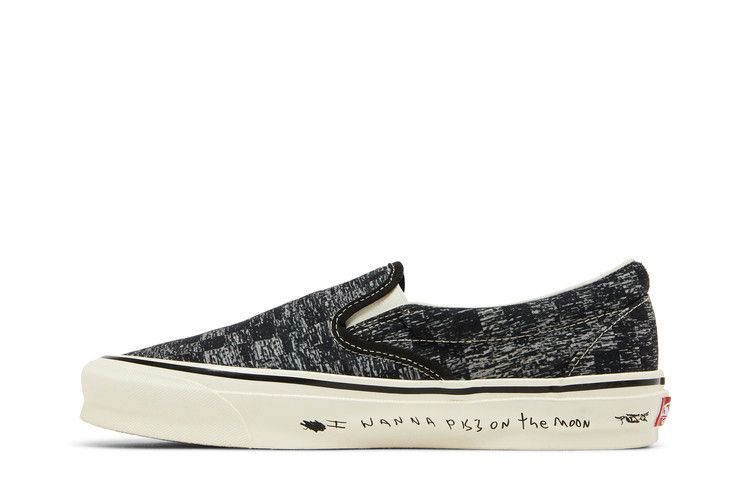 Модель Raised by Wolves x Vans OG Classic Slip-On LX 'TV Static' создана в рамках капсульной коллекции с фотографом Джимом Голдбергом, удостоенным наград. Его фундаментальная книга 1995 года "Raised by Wolves" послужила вдохновением для дизайна проекта, материализовавшись в виде рассеянного клетчатого принта, напоминающего статические помехи на экране телевизора с ЭЛТ. Подошва кроссовок Off-White украшена напечатанным от руки текстом "Ставь четвертаки в музыкальный автомат и сучись над музыкой".