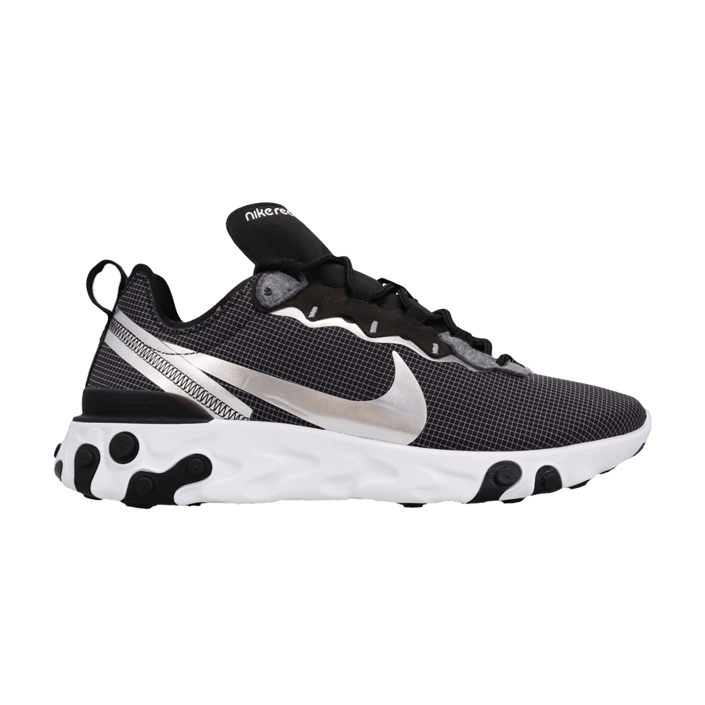 Модель React Element 55 "Black" вышла в сентябре 2019 года в ночном цвете с темно-серым брендингом и отделкой. Эти гибридные кроссовки с линиями дизайна, напоминающими о классических спортивных стилях прошлого, таких как Nike Internationalist, расположены на пенополиуретановой амортизации React, обеспечивающей ностальгическую вибрацию, упругий ход и оптимальную отдачу энергии. Под ногами усиленная резина и подошва создают надежную защиту от ударов и сцепление с поверхностью.