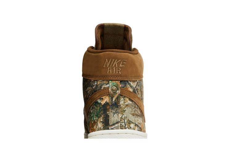 В модели Realtree x Jordan Air Ship PE SP 'Edge Camo' традиционный кожаный верх заменен на воздухопроницаемый канвас с рисунком Realtree Edge camo в оттенках загара, коричневого и зеленого. Земляная палитра дополнена нубуком Oil Brown на мягком воротнике и фирменном логотипе Swoosh. Кроссовки имеют резиновую подошву с белыми боковыми стенками и прочную подошву из коричневой резины.