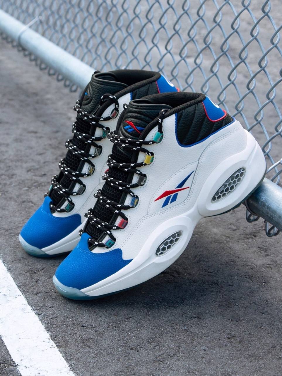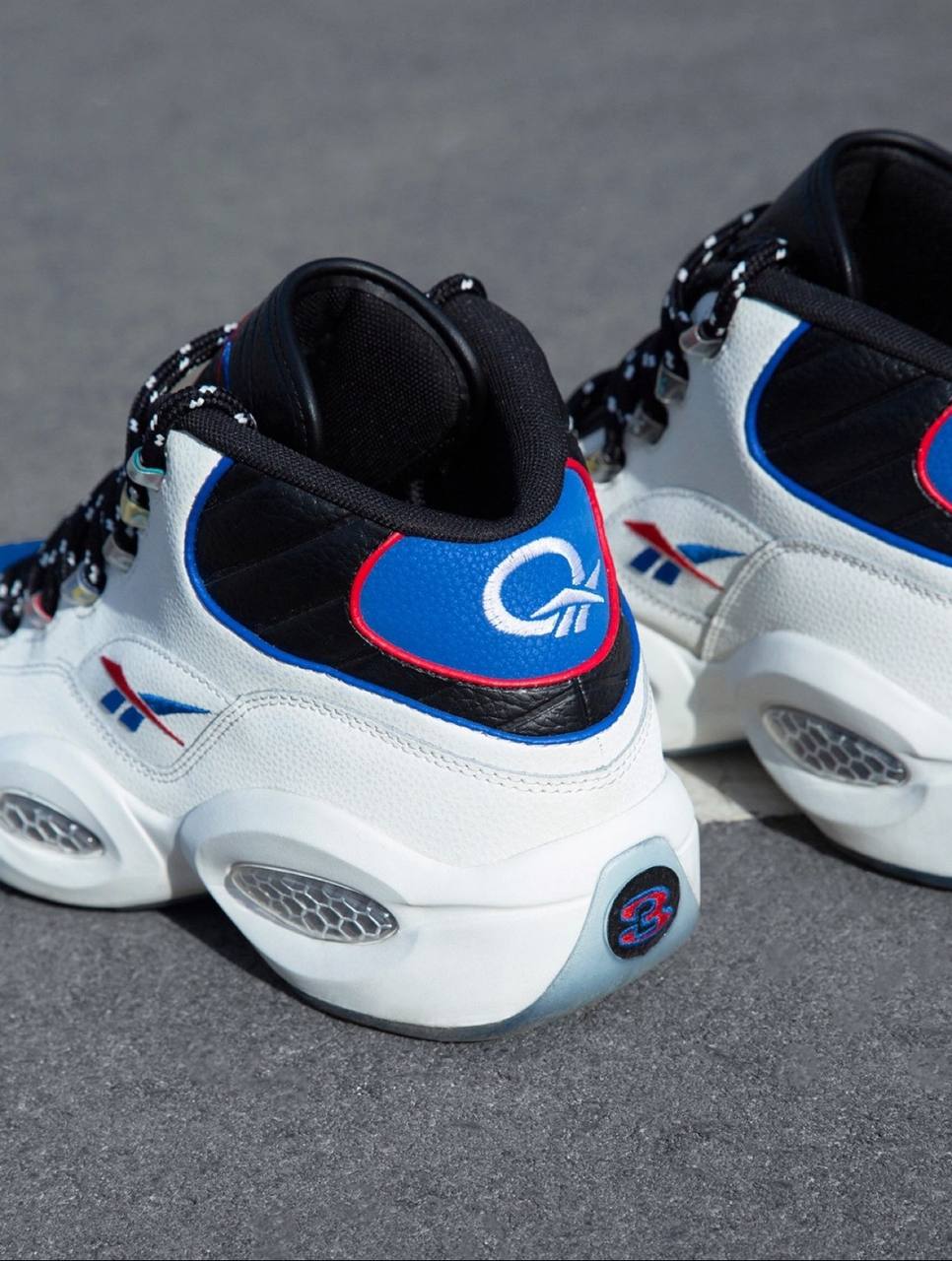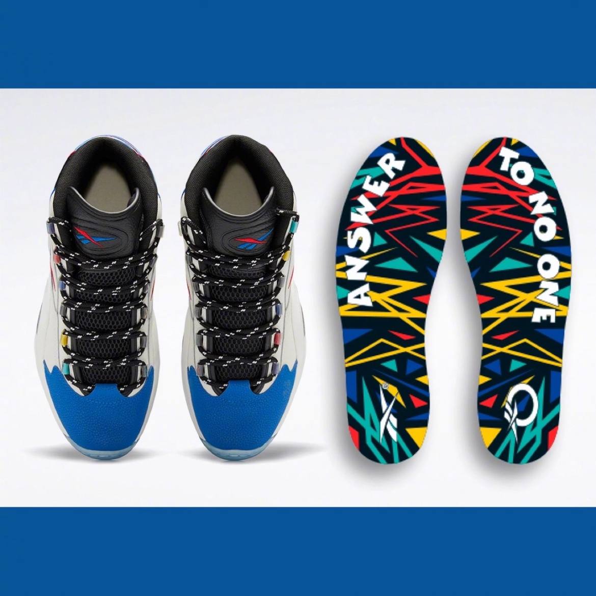 Модель Reebok Question Mid "Answer To No One" вдохновлена дерзким поведением Аллена Айверсона и его решимостью доказать, что критики и сомневающиеся не правы. Верхняя часть выполнена из белой кожи, а мысок - из кожи с шагренью контрастного синего цвета. На разноцветных люверсах написано "Reebok", а логотип бренда Vector украшает язычок и четверть панели в синем и красном цветах. Верхняя часть кроссовка опирается на скульптурную промежуточную подошву из ЭВА, усиленную видимой амортизацией Hexalite и поддерживаемую полупрозрачной резиновой подошвой с синим оттенком.