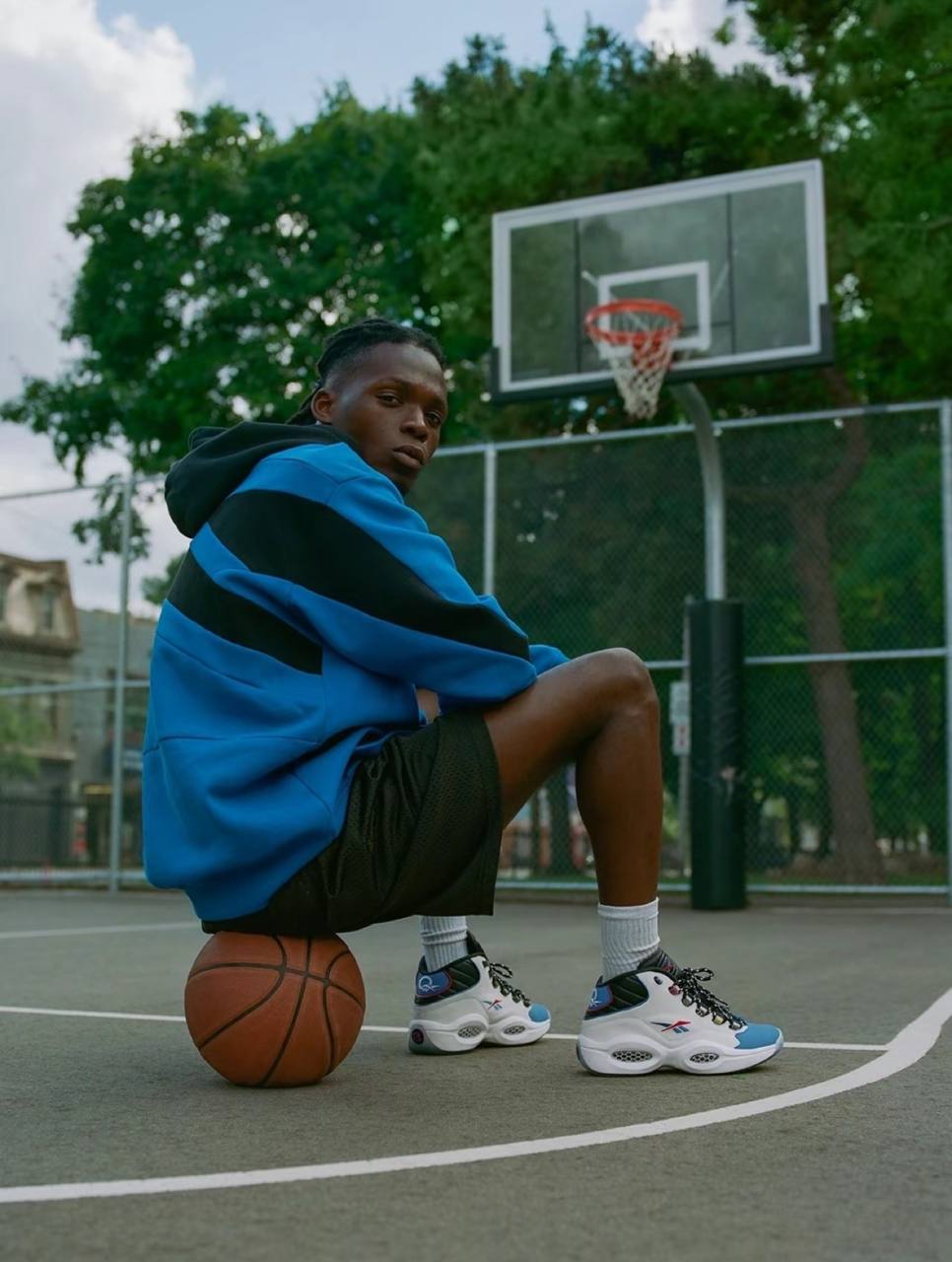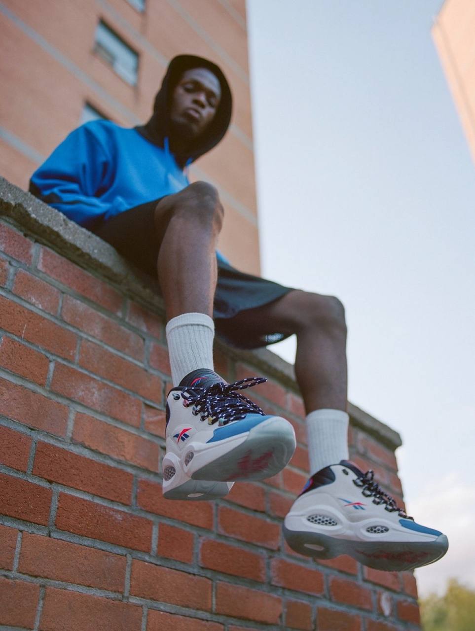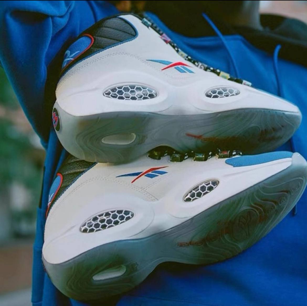 Модель Reebok Question Mid "Answer To No One" вдохновлена дерзким поведением Аллена Айверсона и его решимостью доказать, что критики и сомневающиеся не правы. Верхняя часть выполнена из белой кожи, а мысок - из кожи с шагренью контрастного синего цвета. На разноцветных люверсах написано "Reebok", а логотип бренда Vector украшает язычок и четверть панели в синем и красном цветах. Верхняя часть кроссовка опирается на скульптурную промежуточную подошву из ЭВА, усиленную видимой амортизацией Hexalite и поддерживаемую полупрозрачной резиновой подошвой с синим оттенком.