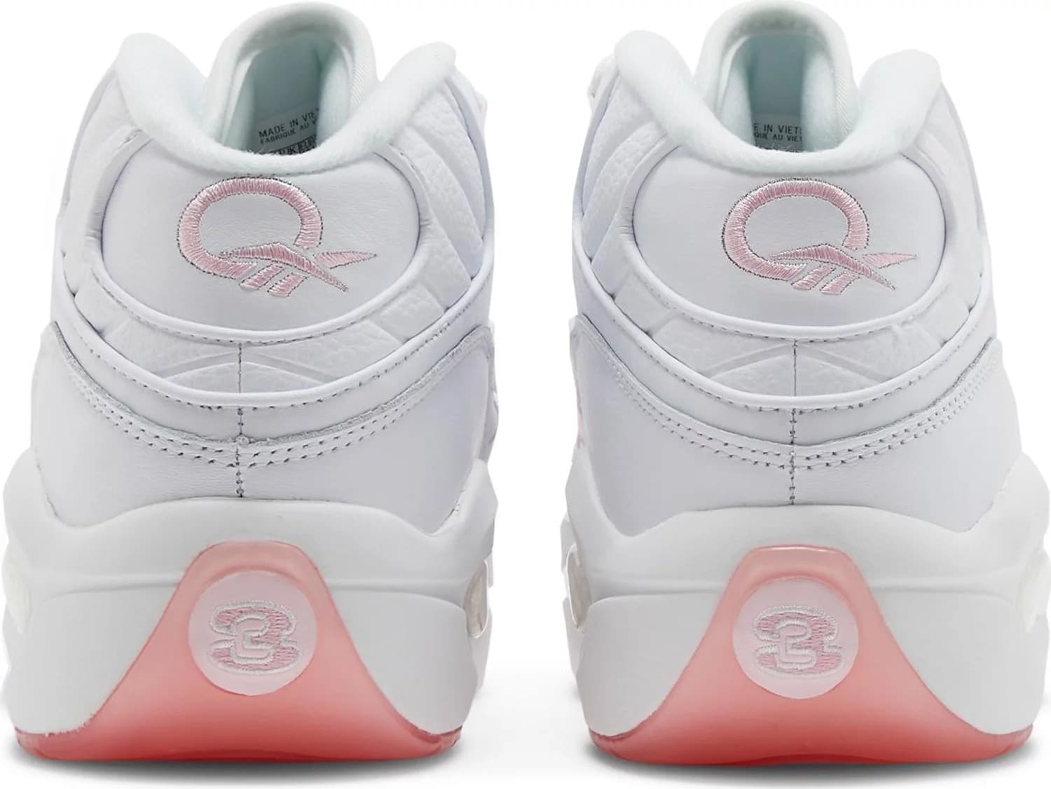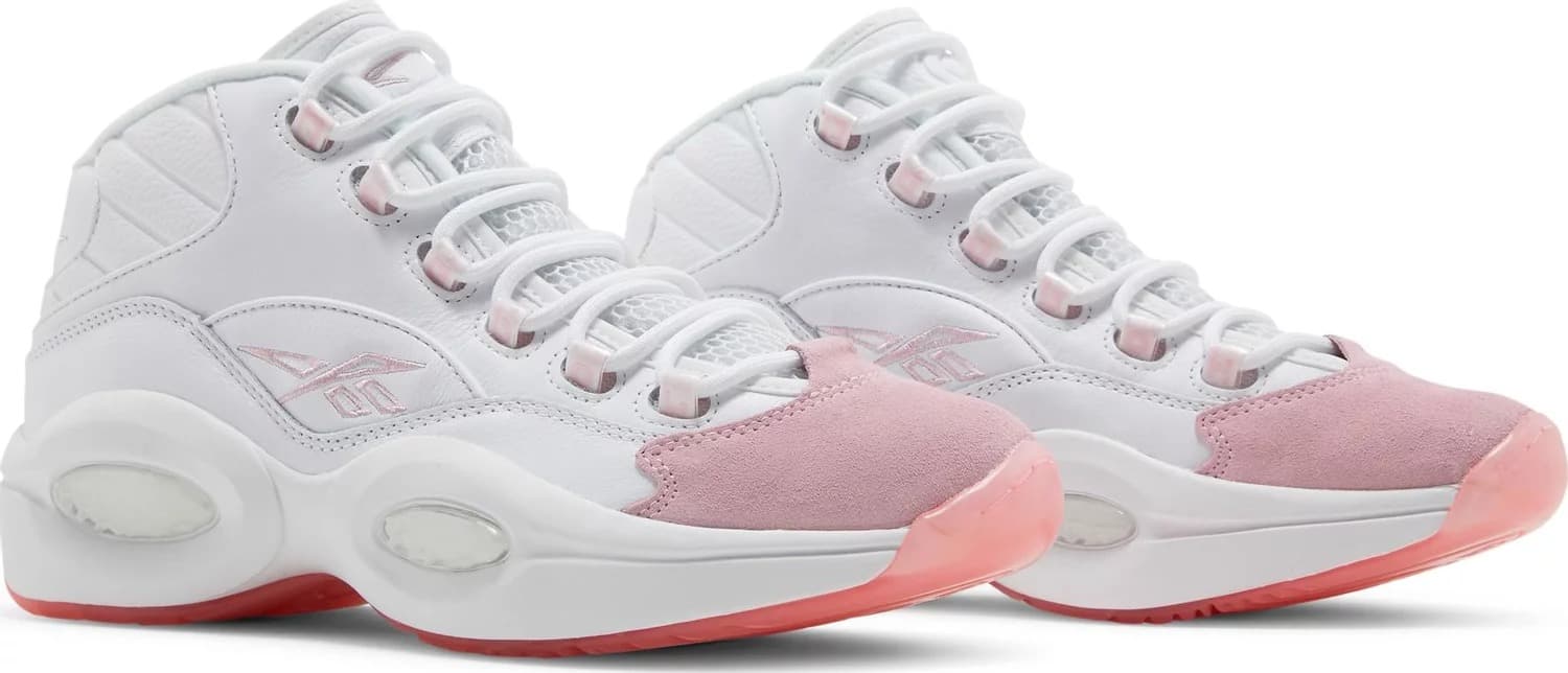 Модель Reebok Question Mid "Pink Toe" обновляет дебютные фирменные кроссовки Аллена Айверсона с помощью простой двухцветной схемы. Верхняя часть выполнена из чистой белой кожи с розовым замшевым мыском и подобранными по цвету элементами брендинга. Они включают надпись "Reebok" на люверсах и вышитый логотип Question на язычке пятки. Видимая амортизация Hexalite усиливает мягкую подошву EVA, а подошва из розовой полупрозрачной резины укреплена для долговечности.