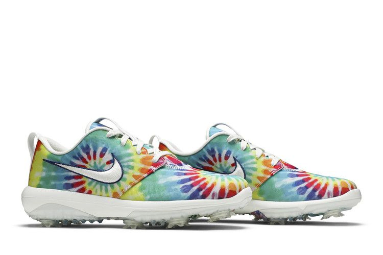 Nike Roshe Golf Tour NRG "Peace, Love and Golf" с радужным рисунком на текстильном верхе - психоделическая дань Сан-Франциско, где в 2020 году пройдет чемпионат PGA и лето любви 1967 года. Легкая амортизация обеспечивается мягкой подошвой из пеноматериала, которая поддерживается полупрозрачной подошвой с надписями "Peace" и "Love", нанесенными на подошву каждого кроссовка. Съемные шипы обеспечивают сцепление с газоном.