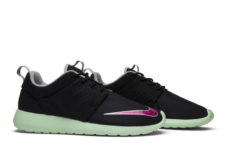 Nike Roshe One FB "Yeezy" выполнены в характерной цветовой палитре, напоминающей о Solar Red Air Yeezy 2 в коллаборации бренда с Канье Уэстом. Черный сетчатый верх кроссовок украшен крапинкой Pink Flash Swoosh на носке, а тональные черные панели на четверти имеют тонкую рептилийную текстуру - отличительную черту Air Yeezy 2. Завершающим элементом дизайна является окраска Fresh Mint на легкой подошве.