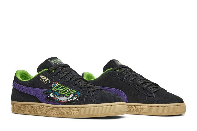 Модель Santa Cruz x PUMA Suede 'Shark' отражает чувства Западного побережья, присущие культовому скейтбордическому бренду. Верх выполнен из черной замши с вшитыми полосками Formstrips несочетаемых цветов: фиолетового на правой стороне каждого ботинка и лаймово-зеленого на левой. Последний оттенок повторяется на внутренней подкладке язычка и воротника. Разноцветная графика Santa Cruz 'Shark' украшает TPU язычок и боковую панель. Резиновая подошва цвета загара поддерживает винтажный низкий топ.