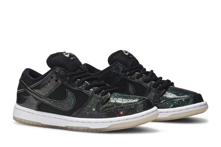 Модель Nike SB Dunk Low TRD QS "Galaxy", выпущенная к празднику 4/20 в 2017 году, имеет верх из черной баллистической нейлоновой сетки с лакированной кожей, переливающиеся накладки с галактическим принтом, белую промежуточную подошву и ледяную голубую полупрозрачную подошву.