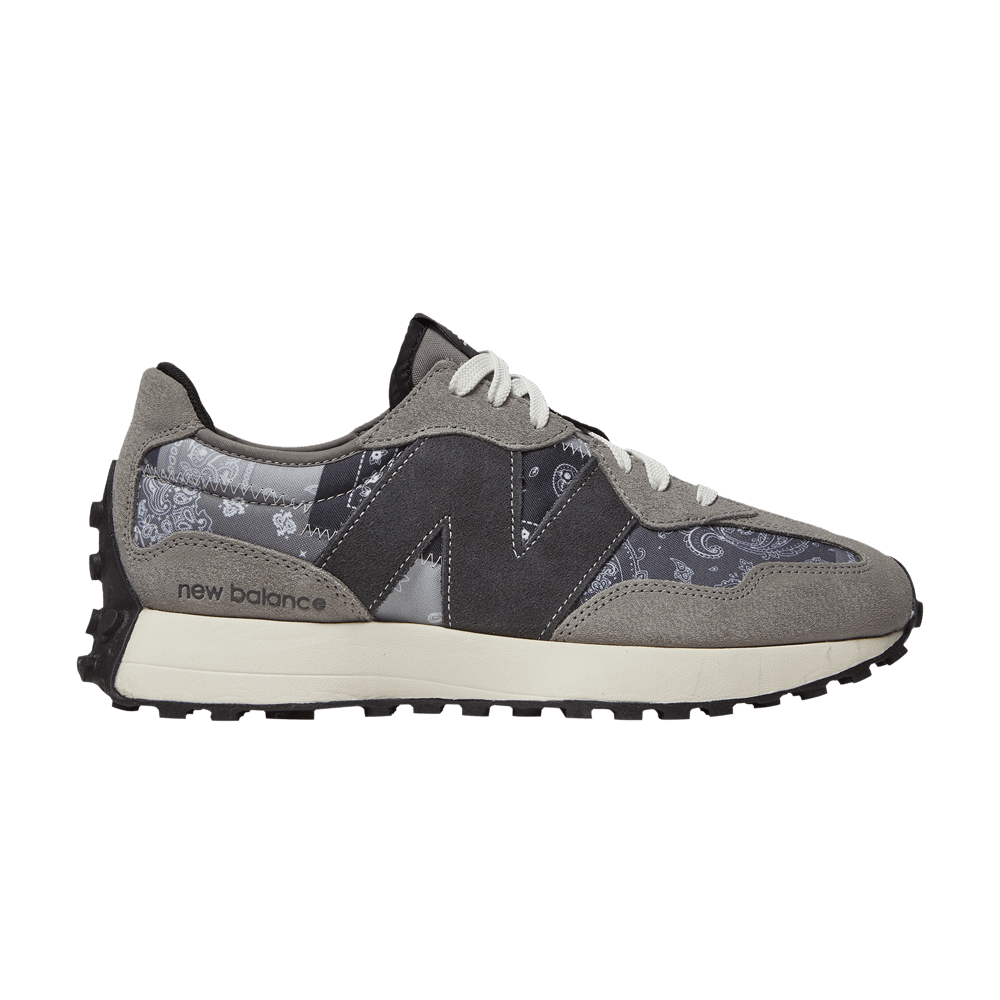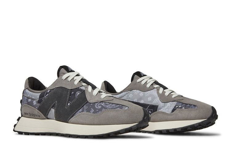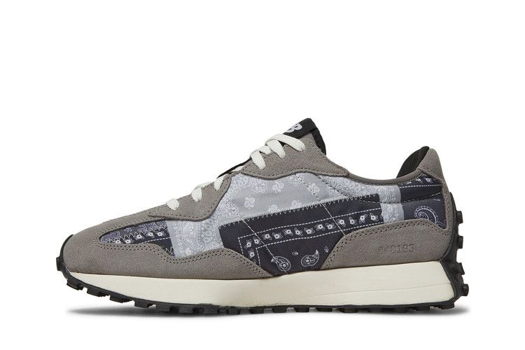 Модель Shoe Palace x New Balance 327 'Heritage Grey', разработанная в сотрудничестве с сетью магазинов спортивной обуви, взята из двух частей "Unity Pack". Эта пара подчеркивает фирменную серую палитру New Balance с текстильным верхом в стиле пэчворк, украшенным тональными принтами в виде банданы. Легкая конструкция укреплена серыми замшевыми накладками и акцентирована черным логотипом "N" на боковой стороне. Кроссовки сидят на винтажной межподошве из ЭВА, укрепленной резиновой подошвой, позаимствованной у модели New Balance 355.