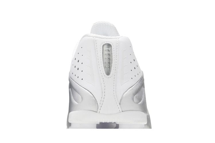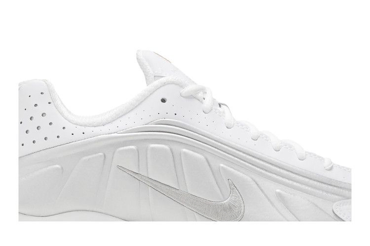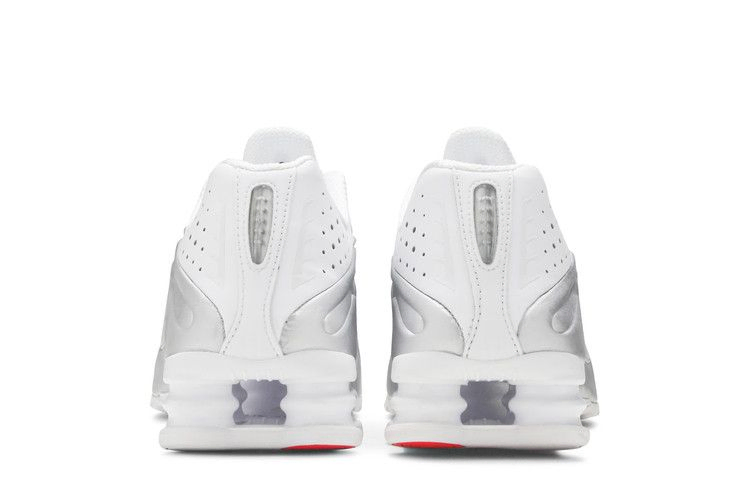 Основанная на первой модели Nike Shox R4, выпущенной в 2000 году, модель 2019 Nike Shox R4 "White Metallic" имеет гладкий белый верх с кожаными накладками на носке и переднем брызговике, а также узнаваемую серебристую накладку на средней панели силуэта. Наиболее заметной особенностью кроссовок является серия столбов Shox в задней части, противопоставленная более обтекаемой подошве в передней части обуви.