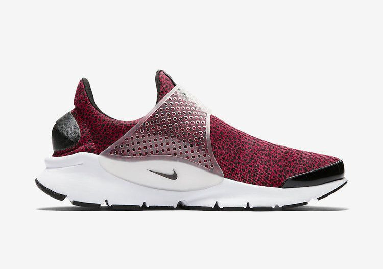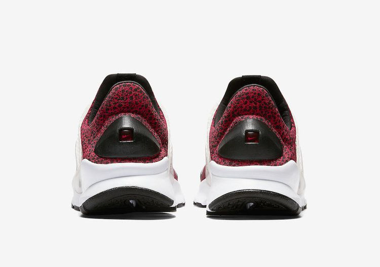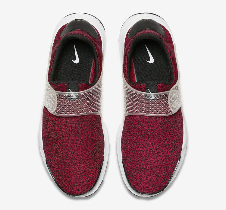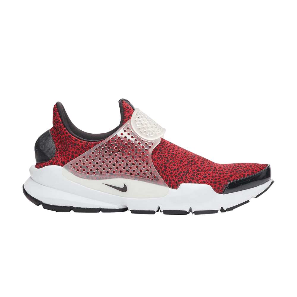 Давний принт Nike Safari появился на Sock Dart в этой модели 2017 года. Узор нанесен на цельную конструкцию верха, которая выполнена в красном цвете. Полупрозрачный ремешок в средней части стопы обеспечивает поддержку, а подошва из материала Phylon переходит в гибкую подошву из материала Duralon.