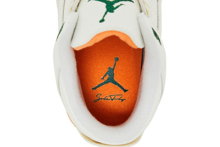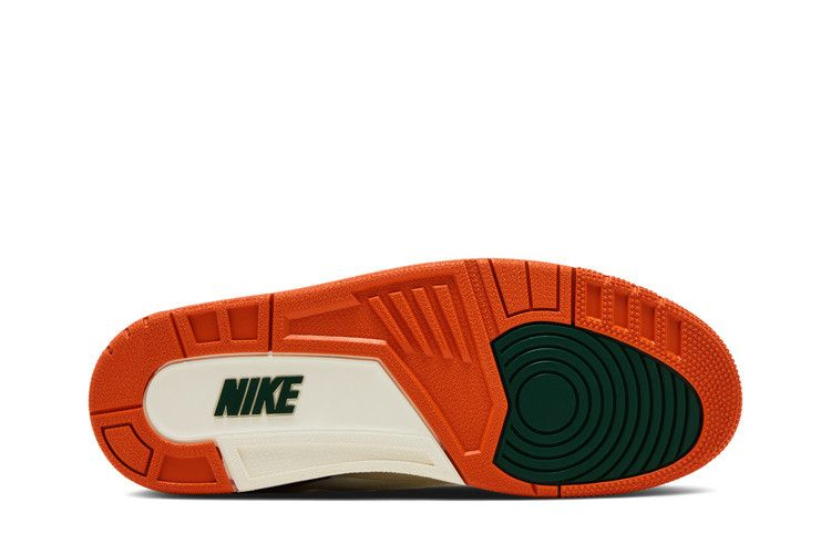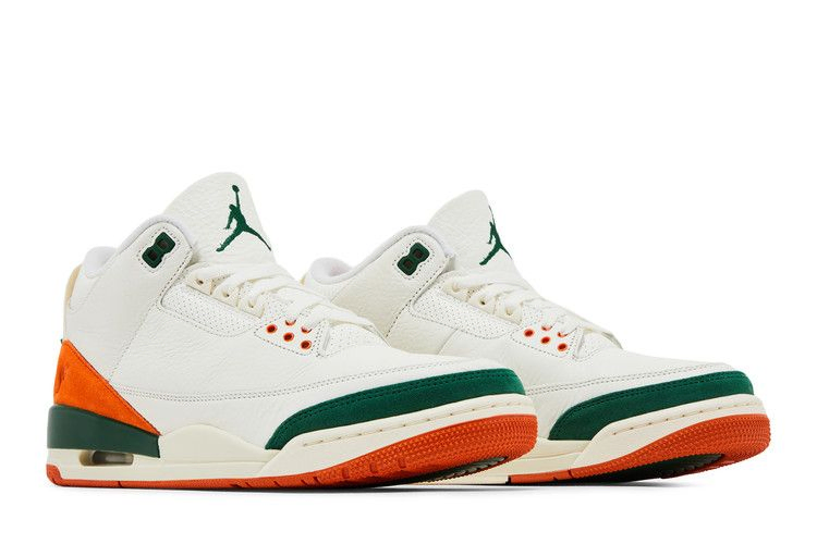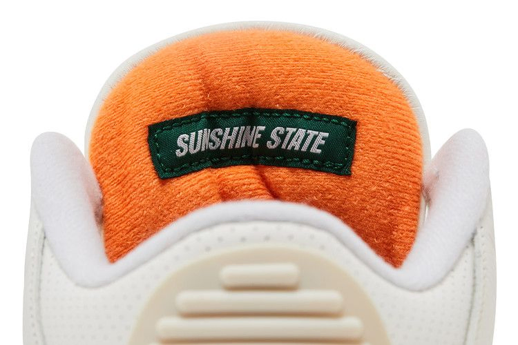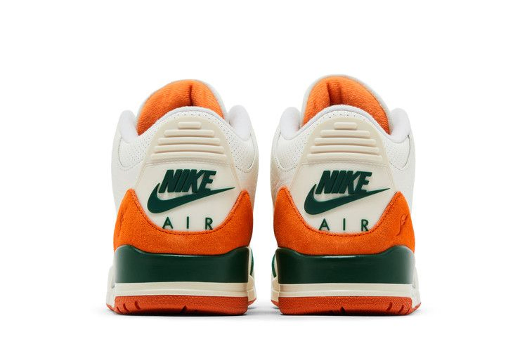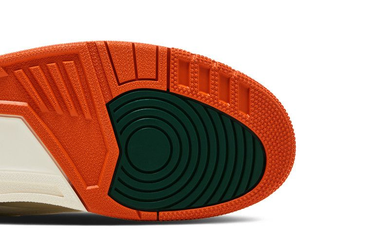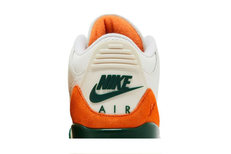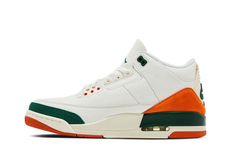 Модель SoleFly x Air Jordan 3 'Miami' выполнена в фирменных цветах команды Miami Hurricanes и имеет кожаный верх цвета Sail с оранжевыми и зелеными замшевыми накладками на носочной и пяточной частях. Логотип Jumpman украшает язычок в виде зеленой вышивки, сочетаясь с люверсами и рельефным брендингом Nike Air на пятке. Винтажная межподошва из полиуретана, оснащенная амортизирующей подошвой Air, украшена зелеными вкраплениями вдоль пятки. Оранжевая резиновая подошва обеспечивает надежное сцепление с поверхностью.