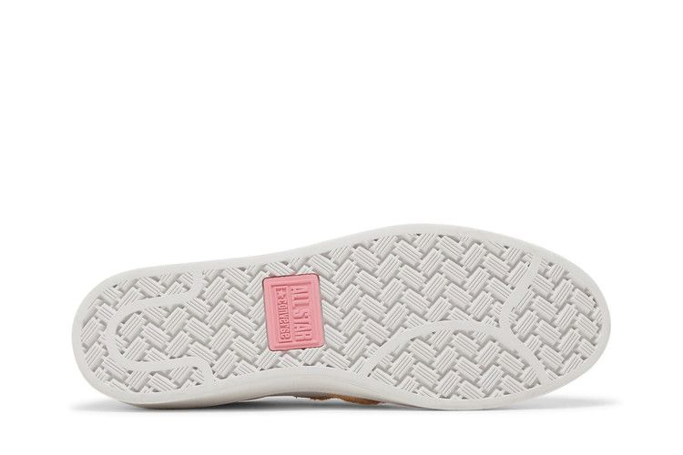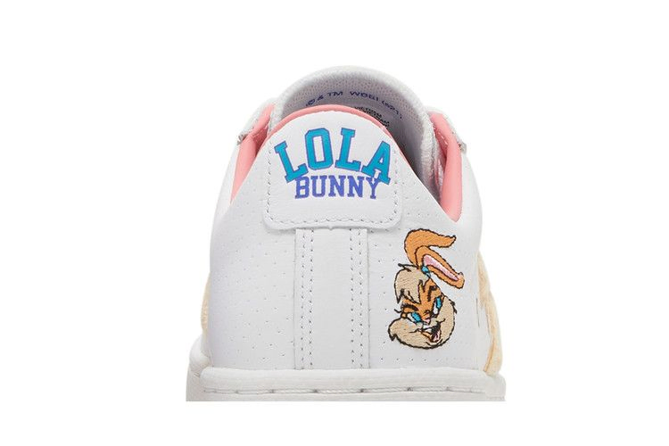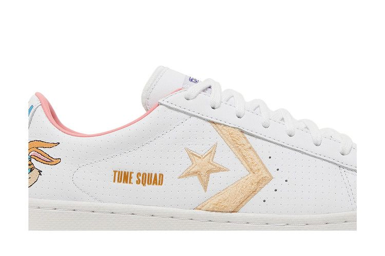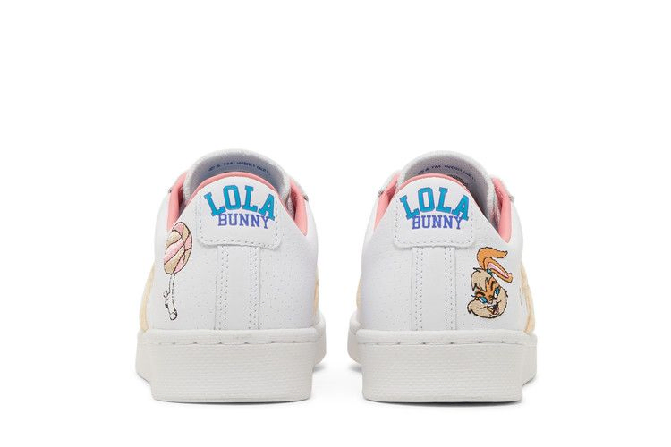 Модель Converse Pro Leather 'Lola' отдает дань уважения яркой героине фильма "Космический джем: A New Legacy". Верх из белой кожи с тонкой перфорацией украшен надписью "Lola Bunny" на язычке пятки и брендингом Star Chevron, покрытым золотисто-загорелым мехом. Надпись "Tune Squad" нанесена на боковую сторону, а на каблуке изображена Лола Банни на правом ботинке и баскетбольный мяч, сидящий на ее пальце, на левом. Внутренняя отделка выполнена из розового текстиля, что придает ей пастельный оттенок.