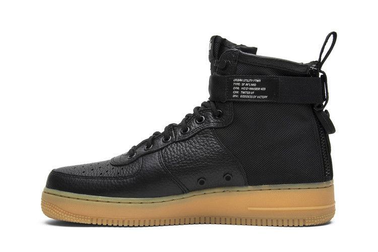 Модель Special Field Air Force 1 Mid "Black Gum", выпущенная в октябре 2017 года, имеет верх из черной галтованной кожи с баллистическим нейлоном на пятке. Кроме того, на язычке имеется серый фирменный знак Nike Air, ремешок на лодыжке и двойная молния на пятке для более удобного входа. Амортизация Nike Air находится в резиновой подошве.