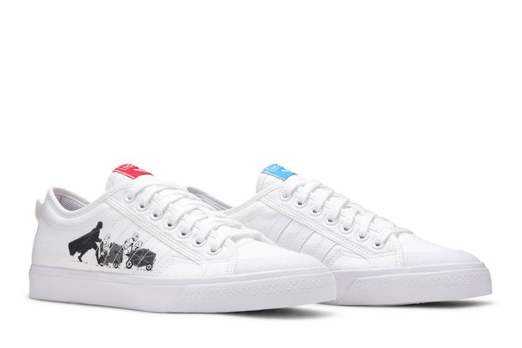 Star Wars x adidas Nizza 'Intergalactic Race' украшает винтажный силуэт игривой графикой, которая показывает обе стороны Силы в движении. На белом текстильном верхе правой кроссовки контрастные красные элементы брендинга дополнены графикой сбоку, изображающей Дарта Вейдера и штурмовиков в кастомных машинах, вдохновленных истребителем TIE и шагоходом AT-AT. Левый ботинок имеет синие акценты и графику, на которой изображена Лея верхом на имперском спидербайке, а эвок размахивает клетчатым флагом. Оба ботинка поддерживаются белой вулканизированной резиновой подошвой.