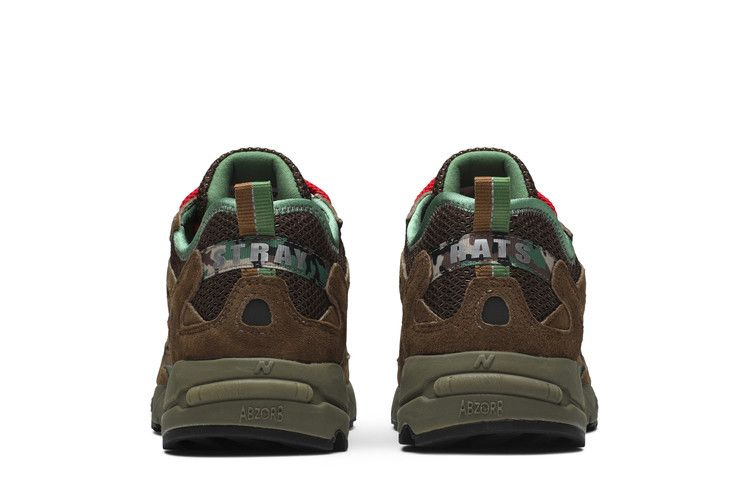 Модель кроссовок Stray Rats x New Balance 827 "Sewer Stompers", созданная в сотрудничестве с брендом уличной одежды из Майами, выполнена в болотной цветовой гамме, подчеркнутой зелеными акцентами на коричневом верхе из сетки и замши. Фирменная надпись "N" оживляет четверть панели фиолетовым и красным, а надпись "STRAY RATS" нанесена на накладки с камо-принтом, украшающие пятку левой и правой части кроссовка.- Артикул: ML827SR2