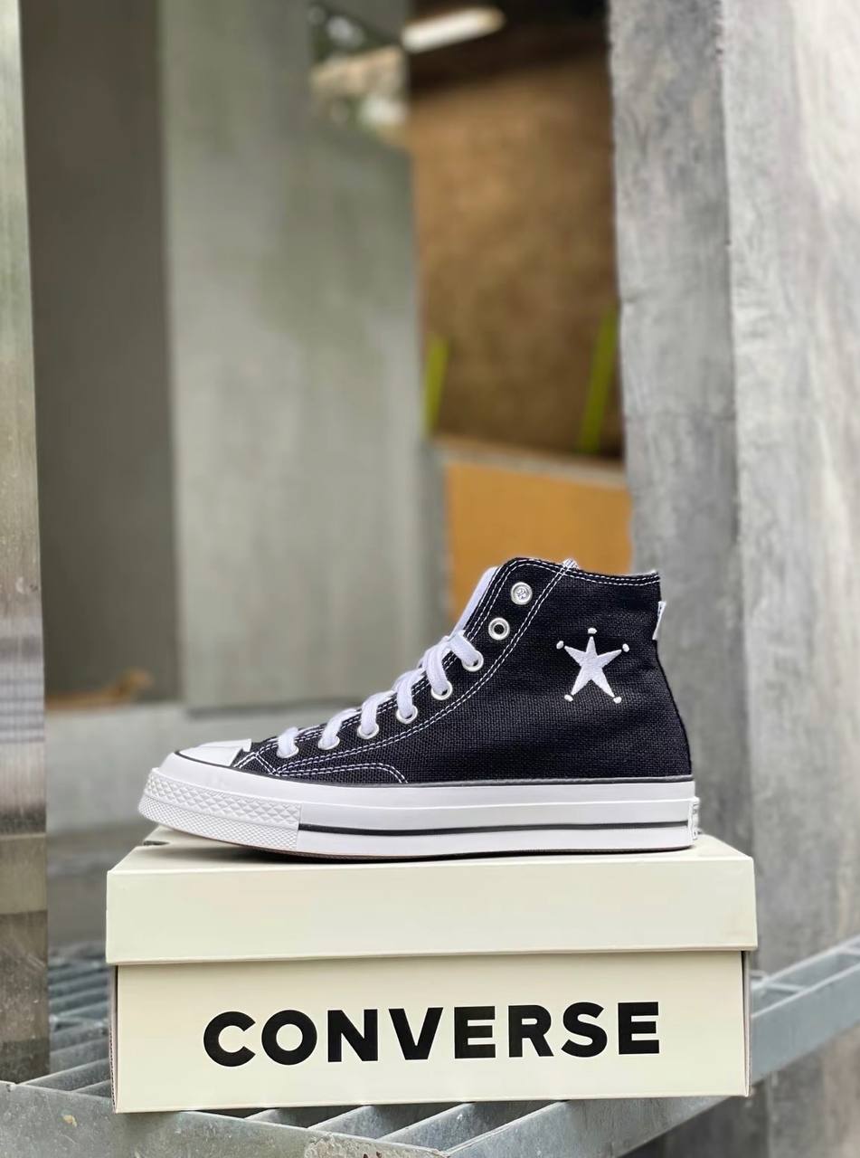 Модель Stussy x Converse Chuck 70 High 'Black' представляет культовый бренд уличной одежды, который переосмыслил основополагающий силуэт. На смену традиционному канвасу пришел черный верх из конопли с вышитым логотипом Star на лодыжке и нашивкой All Star на противоположной стороне. Классический брендинг Stussy расположен на внутренней стороне язычка и на маленькой тканой бирке на пятке. В основе кроссовок лежит белая резиновая подошва с некрашеными боковинами и контрастными черными полосками.- Цвета: Black/White/Black