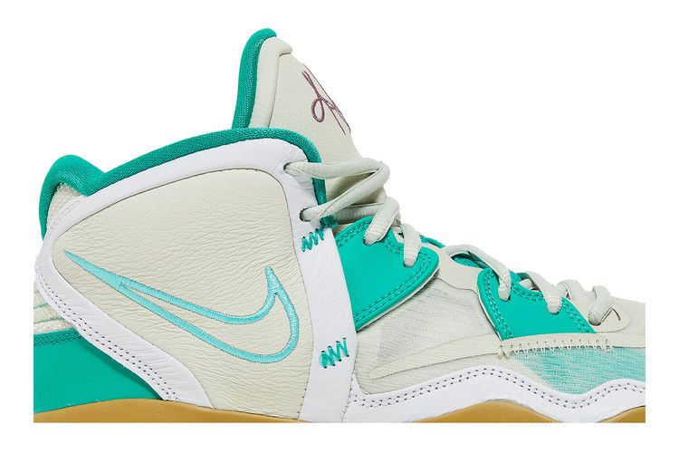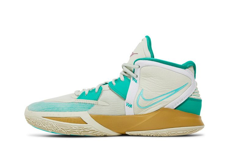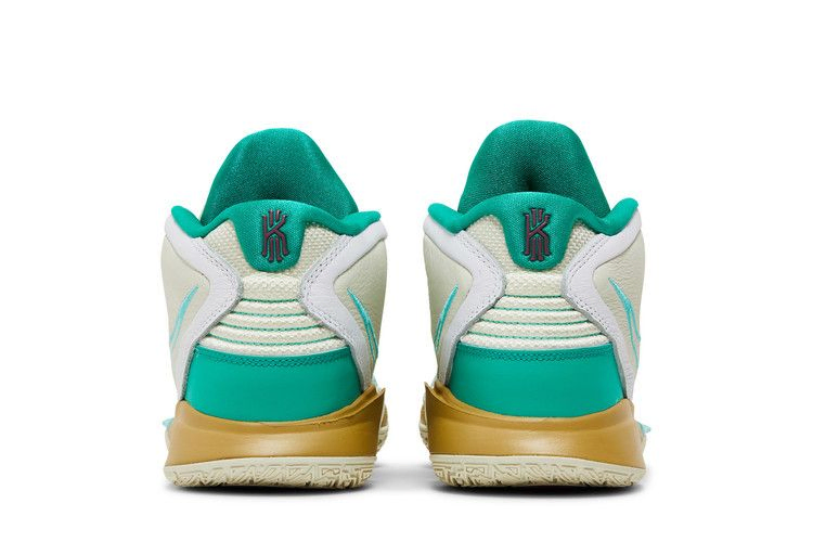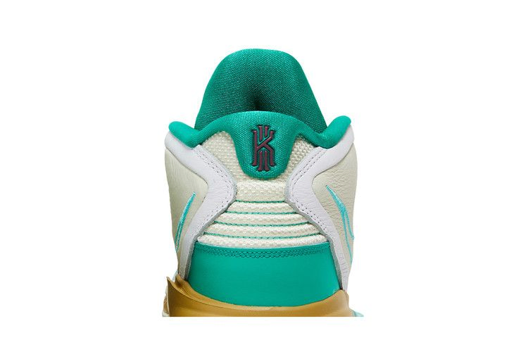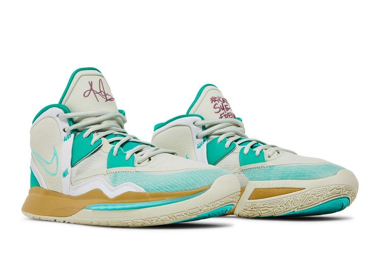 Nike Kyrie Infinity 'Golden Tribute' возвращает знакомую тему, присутствовавшую в предыдущих версиях фирменных кроссовок Кайри Ирвинга: признание заслуг звезды WNBA Сью Берд. Ее профессиональные достижения, а также ее позиция "хорошо выглядеть, хорошо себя чувствовать, хорошо играть" вдохновляют на создание слогана "Keep Sue Fresh", который размещен на левом язычке кроссовка. Верхняя часть кроссовок выполнена из текстиля цвета слоновой кости с тональной кожаной отделкой и изумрудными акцентами. Промежуточная подошва из материала Phylon, дополненная пружинистым блоком Zoom Air в передней части стопы, имеет тускло-золотистую отделку.