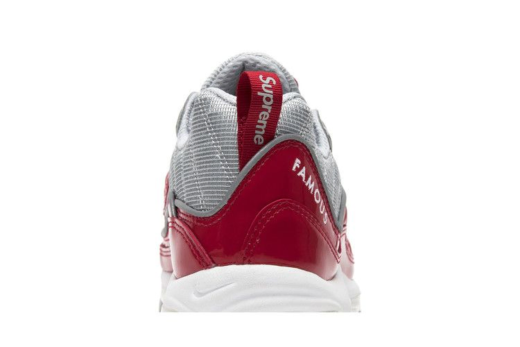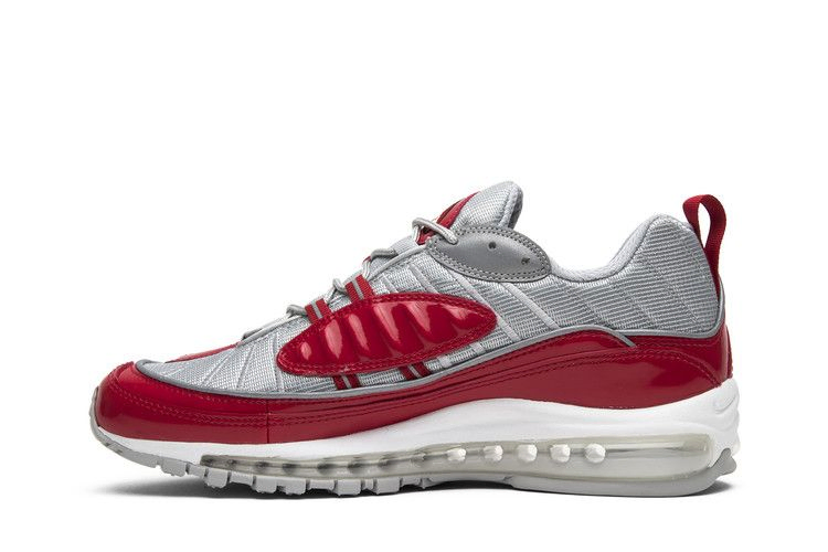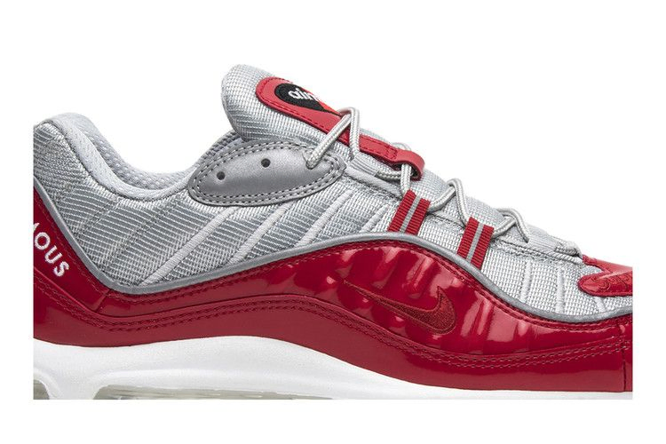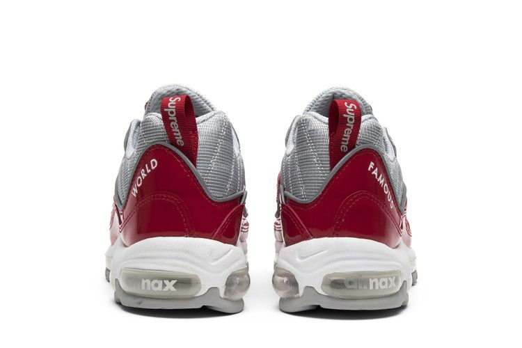 Supreme x Nike Air Max 98 'Red' - это серебристо-металлический сетчатый верх со светоотражающими вставками и накладками из лакированной кожи красного цвета. Кроссовки также украшены брендингом Supreme на пятке и носке, а также брендингом "WORLD FAMOUS" на пятке. Красные" были выпущены в апреле 2016 года вместе с "черными", "змеиными" и "синими" цветами. В рамках сотрудничества также была выпущена шапка Dri-FIT, доступная в пяти цветах.