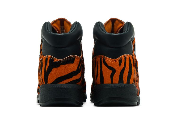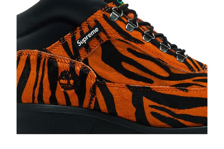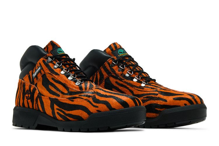 Supreme x Timberland Field Boot 'Tiger' представляет собой вдохновленную дикой природой модель от нью-йоркского скейт-бренда. Черные тигриные полосы украшают оранжевый верх из шерсти пони, металлические проушины D-кольца и мягкий воротник из черной кожи. Фирменные элементы включают шильдик Supreme на боковой лодыжке и логотип дерева Timberland, вышитый на боковой пятке. Подошва из черной резины с шипами обеспечивает надежное сцепление с поверхностью.