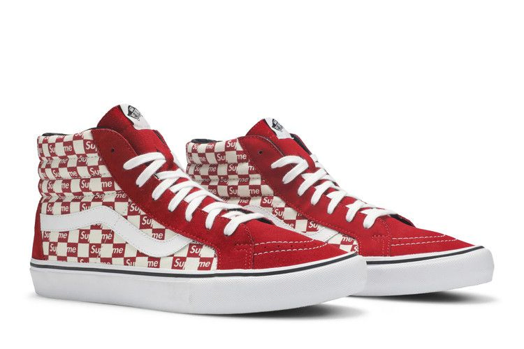 В 2016 году Vans и Supreme объединили усилия, чтобы нанести на силуэт Sk8-Hi каждый из своих самых знаковых знаков. В версии "Checkered Red" логотип Supreme и шашечный узор Vans сочетаются на канвасе четвертей, что делает образ одновременно знакомым и совершенно новым. Красная замша премиум-класса и классическая джазовая полоска завершают совместный образ в первозданном белом цвете.