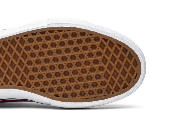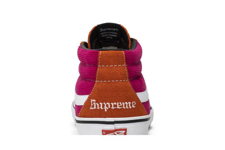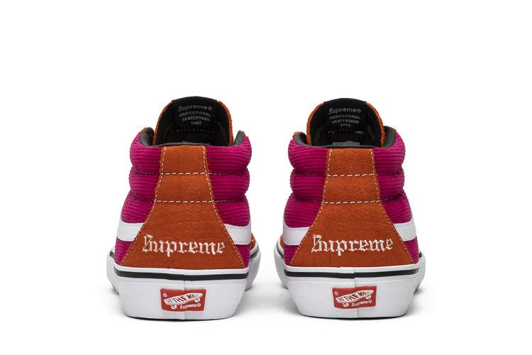 Vans пригласил стритвир-бренд Supreme для создания экзотической комбинации материалов для своих классических скейтшопов. Модель Supreme x Sk8 Mid Pro 'Corduroy Croc' выполнена из яркого пурпурного вельветового текстиля на четвертьпанели и ржаво-оранжевых крокодиловых акцентов на контрастных замшевых панелях. Брендинг Supreme, выполненный староанглийским шрифтом, пришит к пятке, а шнурки, межподошва и джазовая полоска выполнены в белом цвете.