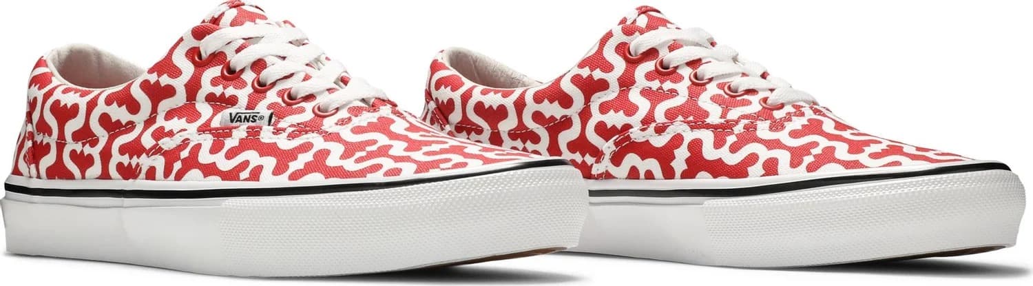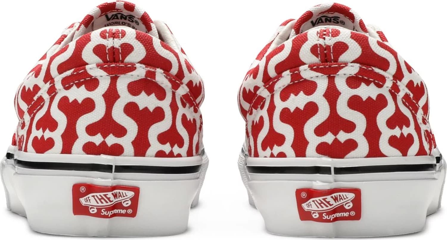 Кеды Supreme x Vans Era 'Red' взяты из набора "Monogram S", в котором представлены три варианта расцветки Era и Skate Grosso Mid. Как и в других моделях, эта пара демонстрирует двухцветный принт по всей верхней части. Стелька выполнена из белой кожи и оснащена стелькой PopCush для дополнительной защиты от ударов и возврата энергии. Брендинг Supreme ограничен красным номерным знаком на задней части вулканизированной подошвы. Резиновая подошва Vans с вафельным протектором обеспечивает превосходное сцепление с поверхностью.- Цвета: Red/White