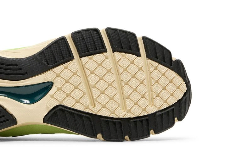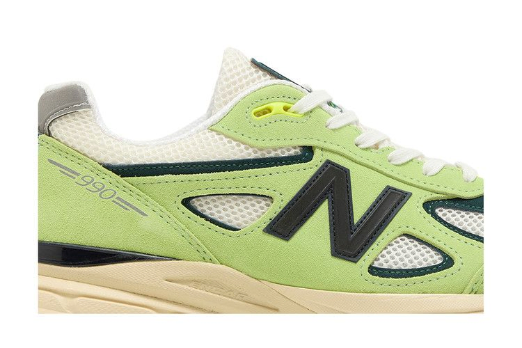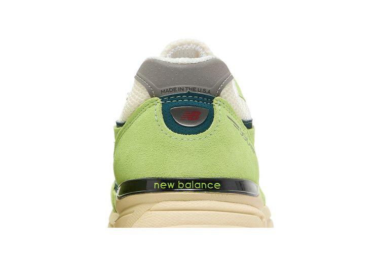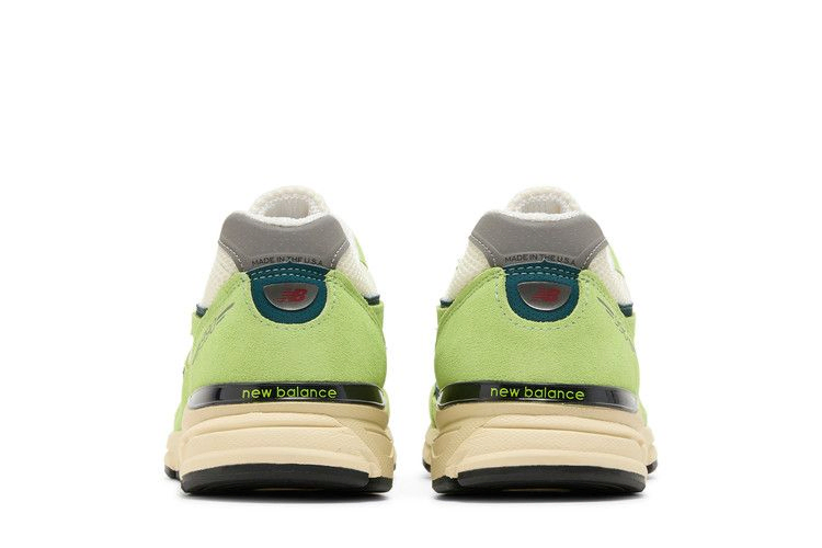 Модель Teddy Santis x New Balance 990v4 Made in USA 'Hi-Lite' имеет белый сетчатый верх, на который наложена неоново-зеленая замша, а последний компонент дополнен деталями из синтетического нубука темно-зеленого оттенка. Черный логотип "N" украшает задник, а флаг на язычке указывает на национальную принадлежность кроссовок. Промежуточная подошва ENCAP от New Balance выполнена в винтажном белом цвете и сочетает в себе легкую пенную основу и прочный полиуретановый обод.