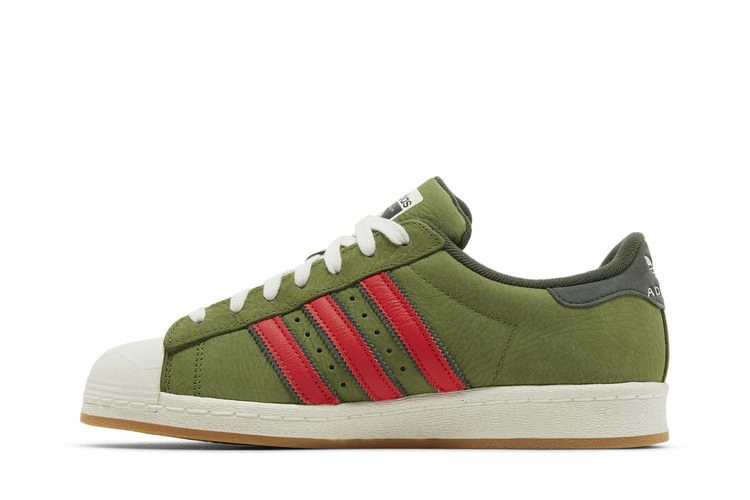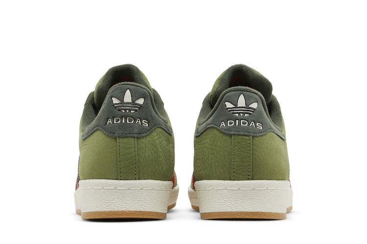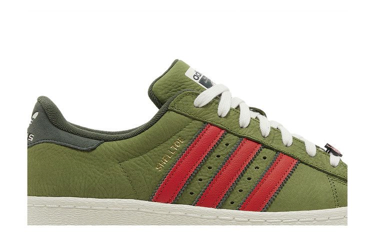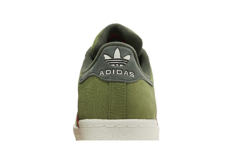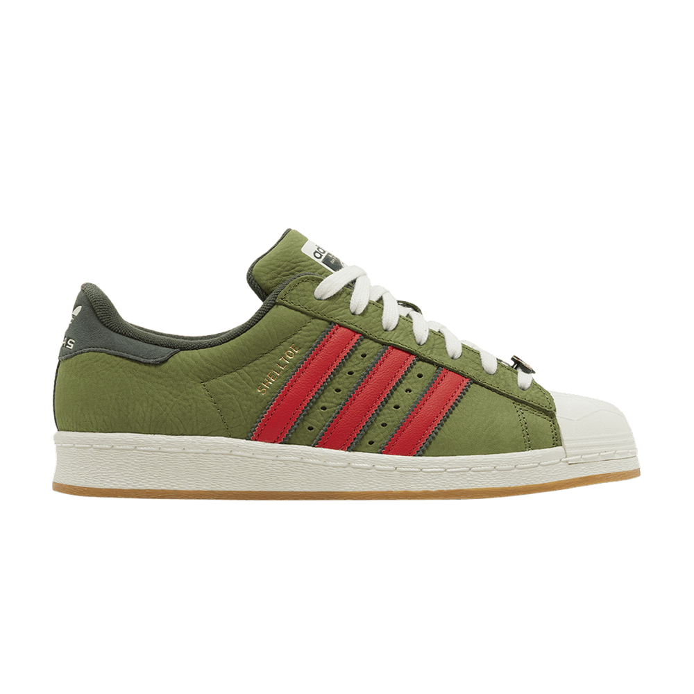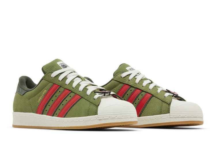 Модель Teenage Mutant Ninja Turtles x adidas Superstar 'Shell-Toe' посвящена 40-летию франшизы TMNT. Низкие кроссовки выполнены из зеленой кожи с контрастными алыми полосками. На боковой стороне золотой фольгой напечатана надпись "SHELLTOE", а на белом резиновом носке изображен черепаший панцирь - буквальный намек на рептилий-супергероев. Дополнительные элементы - стельки с графикой пиццы и украшения на шнурках, созданные по образцу фирменной красной маски Рафаэля. Подошва из резины обеспечивает надежное сцепление с поверхностью.- Артикул: IF9280