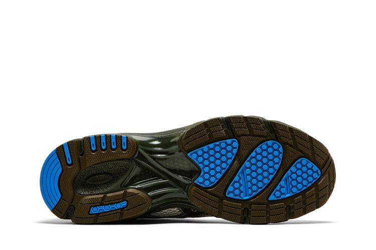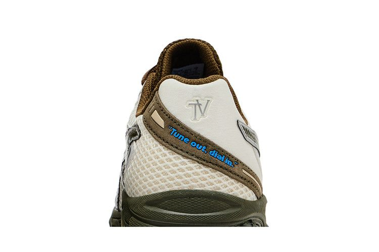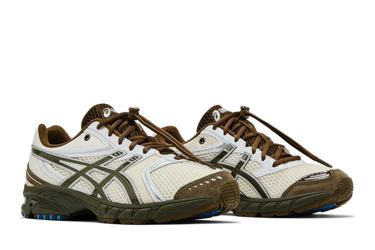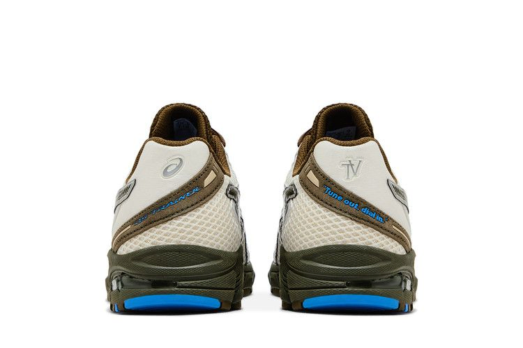 Модель Temptation Vacation x ASICS Gel DS Trainer 14 "Tune out, dial in" вдохновлена природным ландшафтом австралийского побережья. Шнуровка на шнурке фиксирует сетчатый верх из белой ткани, контрастируя с темно-оливковыми акцентами на замшевом мыске и фирменными тигровыми полосками, выделенными серебристой металлической окантовкой. Кроссовки опираются на легкую промежуточную подошву из ЭВА с видимой амортизацией Gel в пятке.