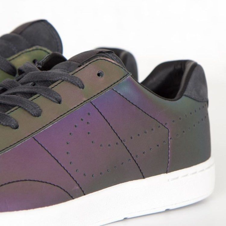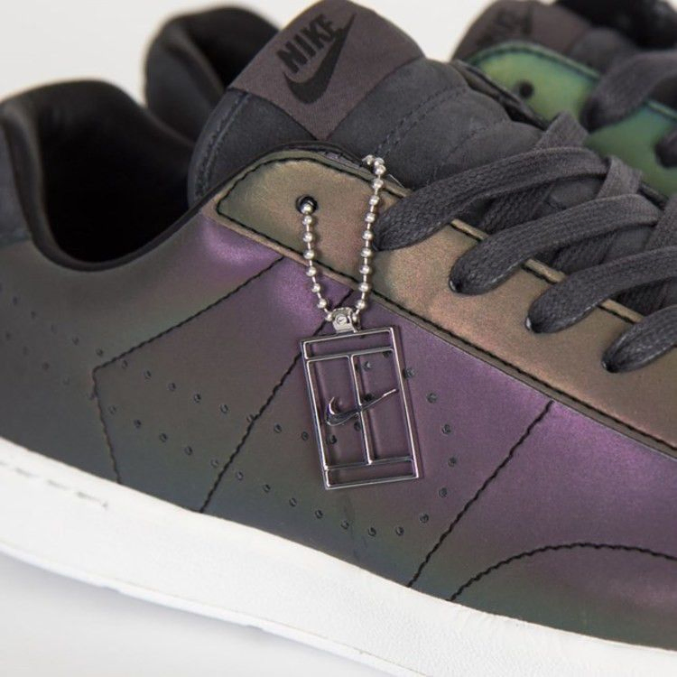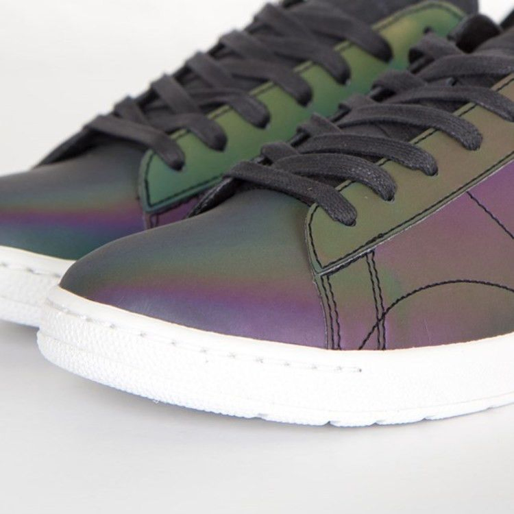 Модель Nike Tennis Classic Ultra Premium QS "Black Iridescent" имеет подошву Ultra, выполненную в четком белом цвете. Верхняя часть кроссовка, выполненная из простой черной кожи, имеет уникальный радужный эффект, который подчеркивается переливами фиолетового, зеленого и желтого цветов. Основной черный цвет используется для шнурков, замшевого язычка и соответствующего замшевого язычка на пятке.