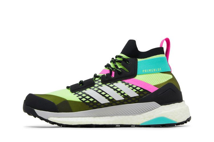 Модель adidas Terrex Free Hiker Primeblue 'Hi-Res Yellow Black' демонстрирует яркие акценты на гибриде кроссовок и ботинок, созданном для приключений на природе. Шнуровка в стиле Ghillie фиксирует водоотталкивающий верх из материала Primeknit, окрашенный в неоново-желтый цвет и частично изготовленный из переработанных материалов, включая Parley Ocean Plastic. Стелька цвета фуксии перекинута через заднюю часть трикотажной манжеты, которая обеспечивает расширенный охват и носочную посадку. Отзывчивая амортизация обеспечивается промежуточной подошвой Boost, поддерживаемой резиновой подошвой Continental.
