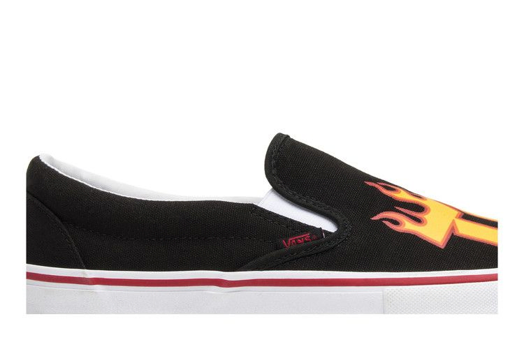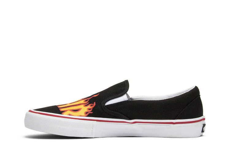 Компания Vans объединилась с Thrasher для создания совместного предложения, ориентированного на скейт, в котором используется модель Slip-On Pro. В этой модели, усовершенствованной по сравнению с классическими Slip-On, использована технология UltraCush от Vans. Верхняя часть выполнена из черного канваса, подчеркнутого огненным логотипом Thrasher на носке. Красная лисья полоса служит дополнительным намеком на цвета давнего скейт-журнала.