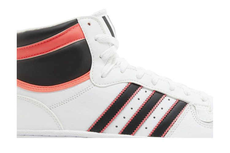 Модель adidas Top Ten RB "White Turbo" представляет собой уличные кроссовки для активного отдыха, которые изначально дебютировали в 1979 году как лучшая баскетбольная обувь adidas. Верхняя часть кроссовок изготовлена из белой кожи и украшена контрастными черными полосками, выделенными ярко-малиновым цветом. Перфорированные детали в области задника обеспечивают повышенную воздухопроницаемость, а высокий воротник с мягкой текстильной подкладкой обеспечивает комфортную посадку. Под ногами ярко-красная подошва с резиновым протектором "елочка", изначально разработанным для хардвуда НБА.