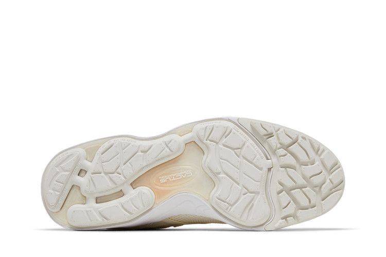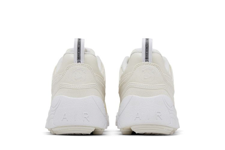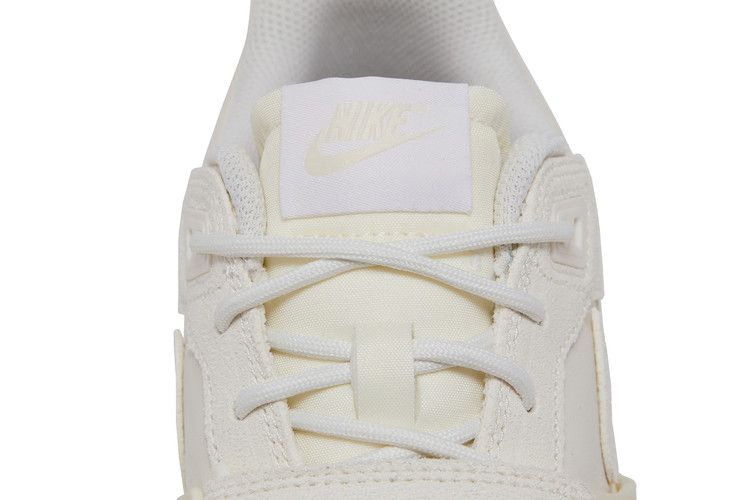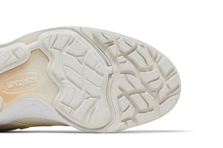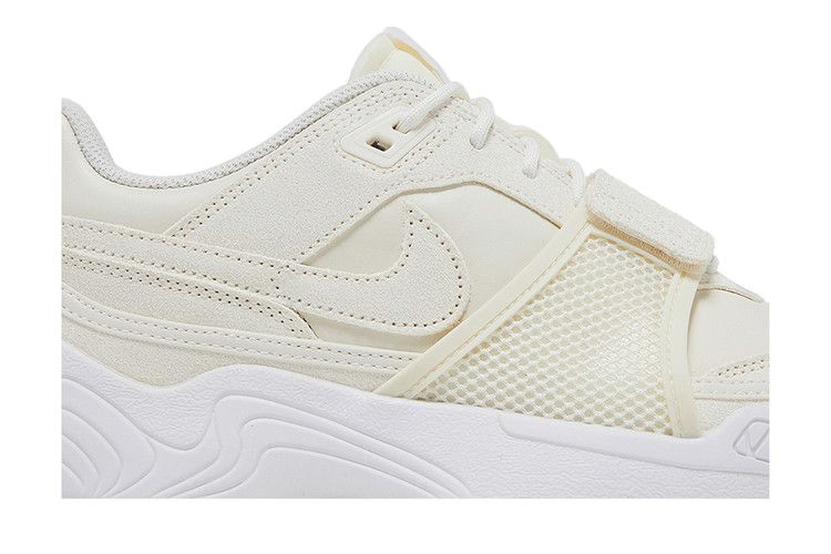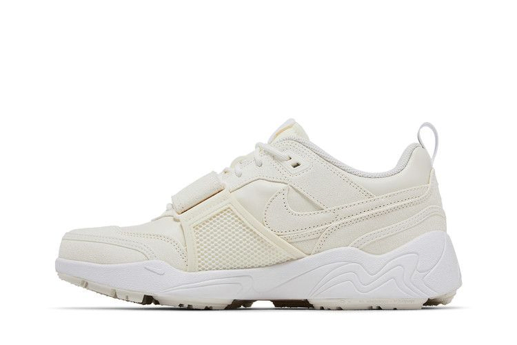 Модель Travis Scott x Nike Zoom Field Jaxx SP 'Sail' представляет собой монохромный вариант силуэта, вдохновленного тренировками. Традиционные шнурки и регулируемый ремешок на передней части стопы фиксируют кожаный верх кремового цвета, укрепленный тональными накладками из ворсистой замши. На язычке красуется тканая бирка Nike, а заднюю часть пятки украшает графический смайлик Cactus Jack от Трэвиса Скотта. Кроссовки опираются на скульптурную межподошву из белой пены, созданную по мотивам Nike Spiridon и дополненную амортизацией Zoom Air.
