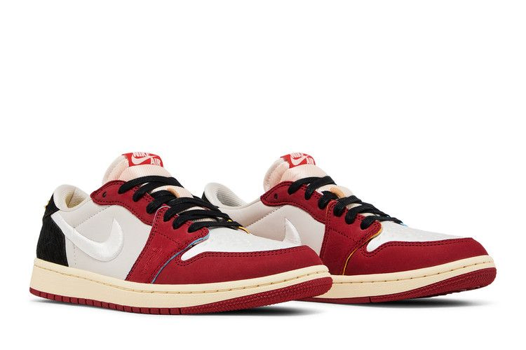 Модель Trophy Room x Air Jordan 1 Retro Low OG SP 'Rookie Card - Home' вдохновлена карточкой новичка Майкла Джордана из Fleer. Эксклюзивная модель Trophy Room использует белый текстильный верх с вышивкой Swoosh. Накладка на передней части стопы из красной кожи имеет контрастную желто-синюю отделку по краям и тональный логотип Trophy Room на боковой стороне. Накладка на пятку и задник из черного тканого текстиля украшены тисненым логотипом Wings цвета золотистого металлика. Резиновая подошва с четкими белыми боковинами и красной подошвой.