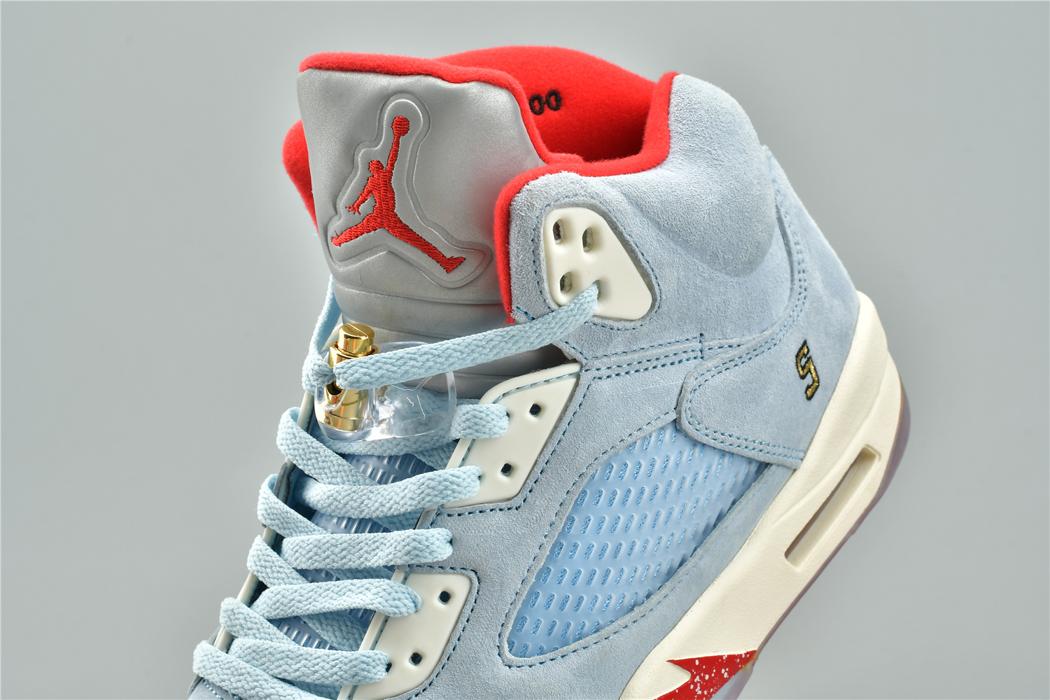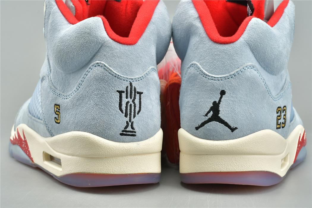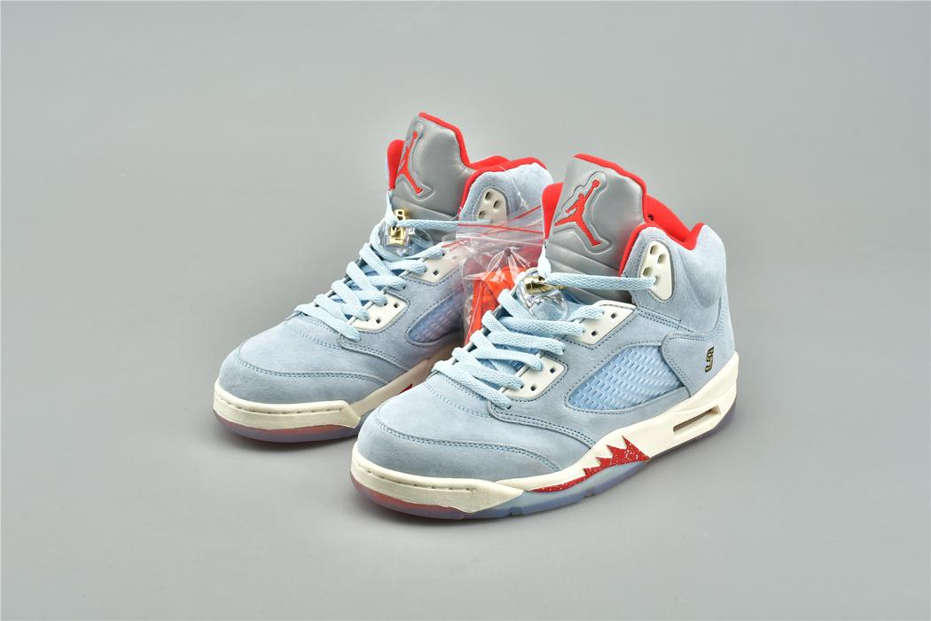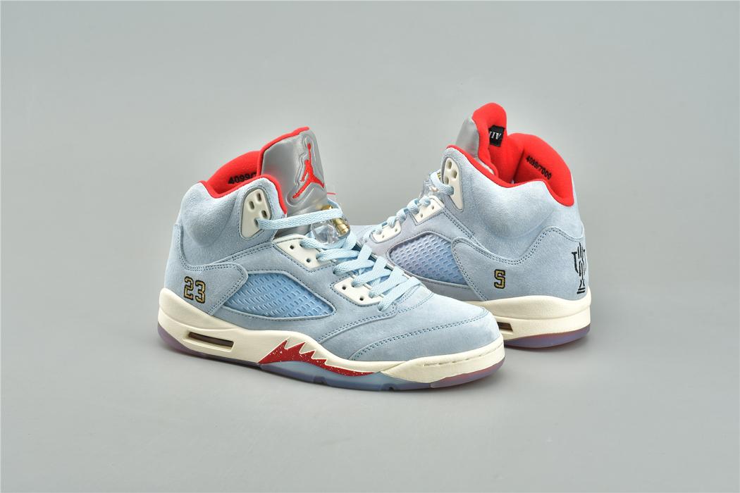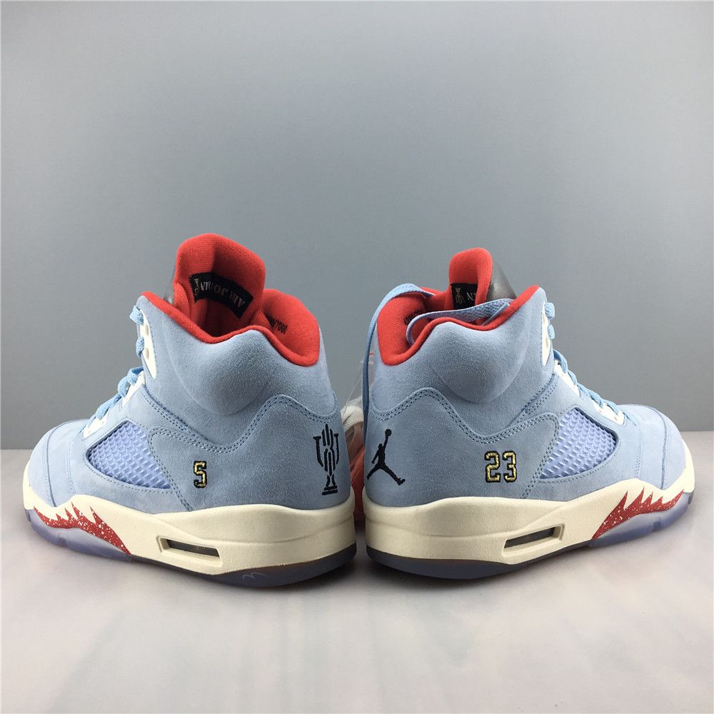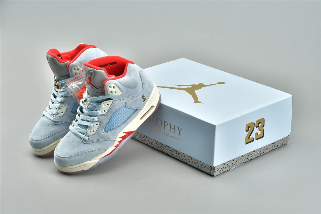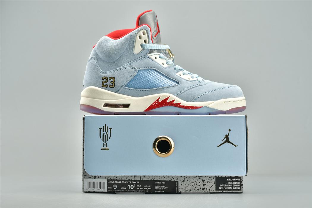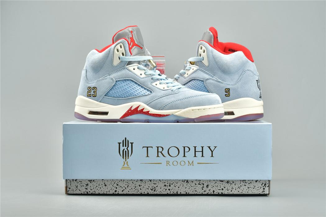 Кроссовки Trophy Room x Air Jordan 5 Ретро вдохновлены реальной комнатой трофеев в доме семьи Джордан. Издание Ice Blue изобилует замшевым верхом, вставками в расцветках University Red и Sail и замком из металлического золота. По бокам вышиты золотыми цифрами - «23» и «5» - номера на майках, которые носил М.Д. и его сын Маркус. Ниже на полупрозрачной резиновой подошве кроссовка изображен рисунок из древесины, напоминающий пол в стиле трофейной комнаты MJ. Всего в мае 2019 года было выпущено 7000 пар, каждая из которых пронумерована по отдельности. Продаются в розницу за 200 долларов.- Цвета: Ice Blue/Sail-Metallic Gold-University Red