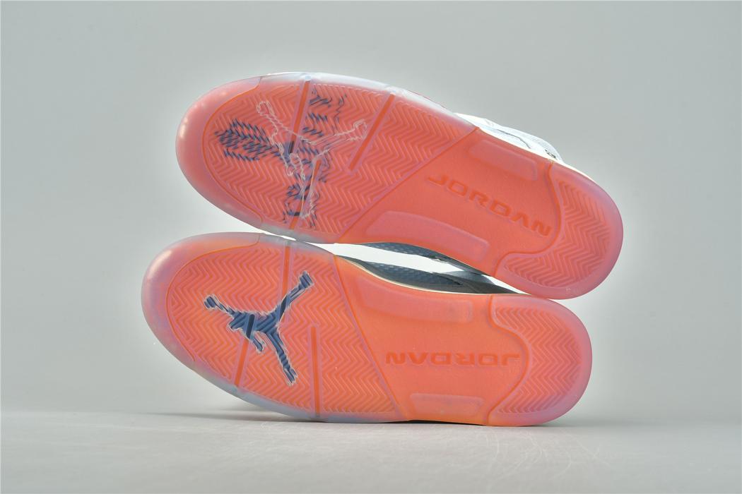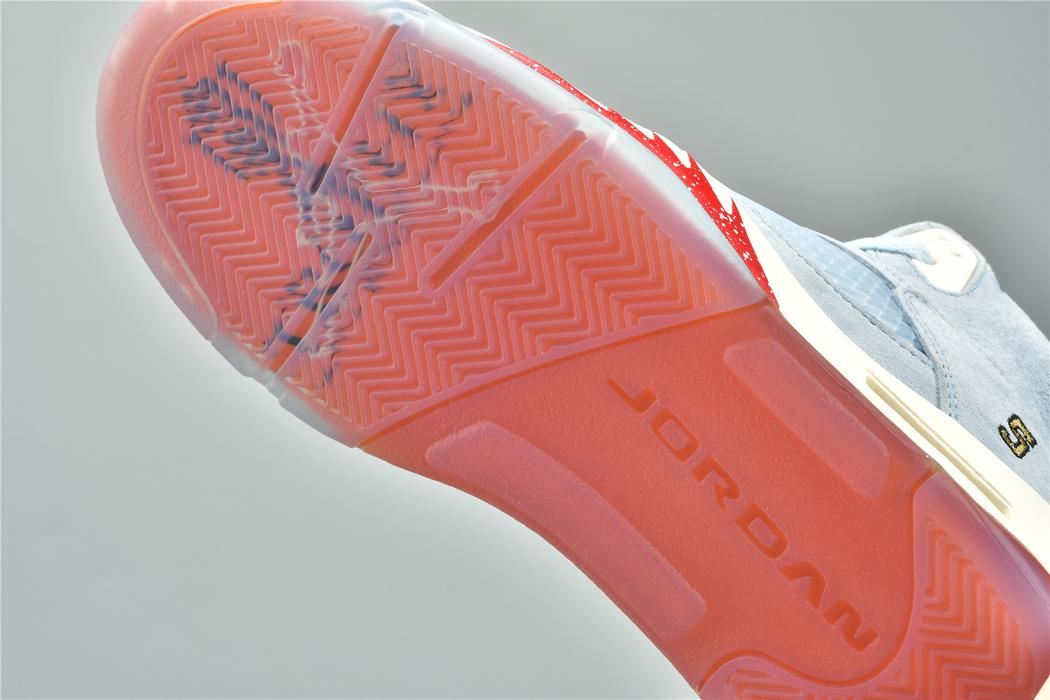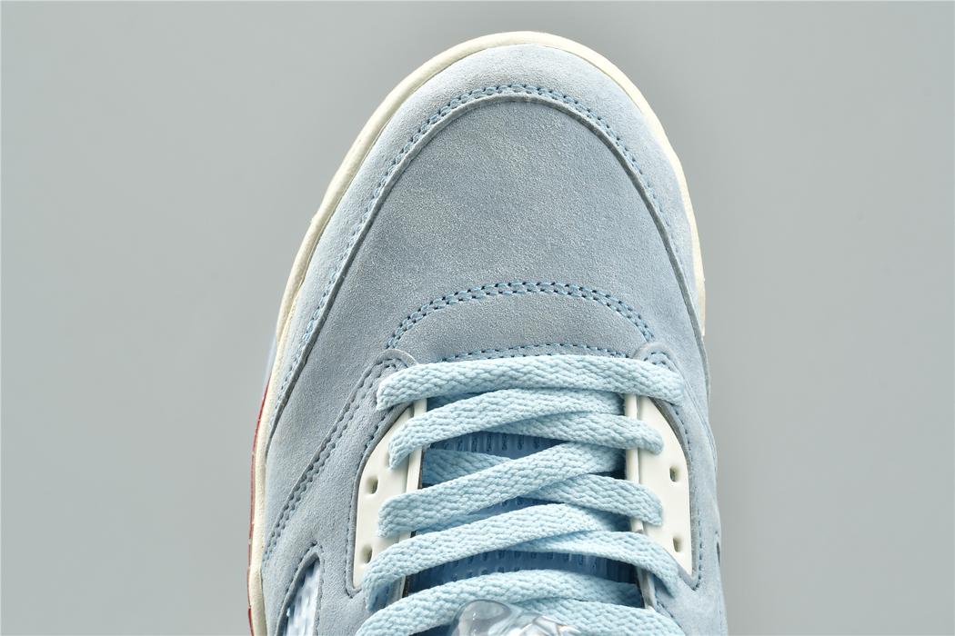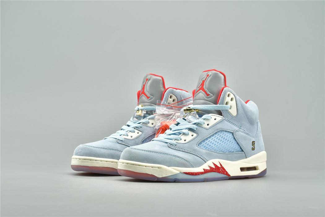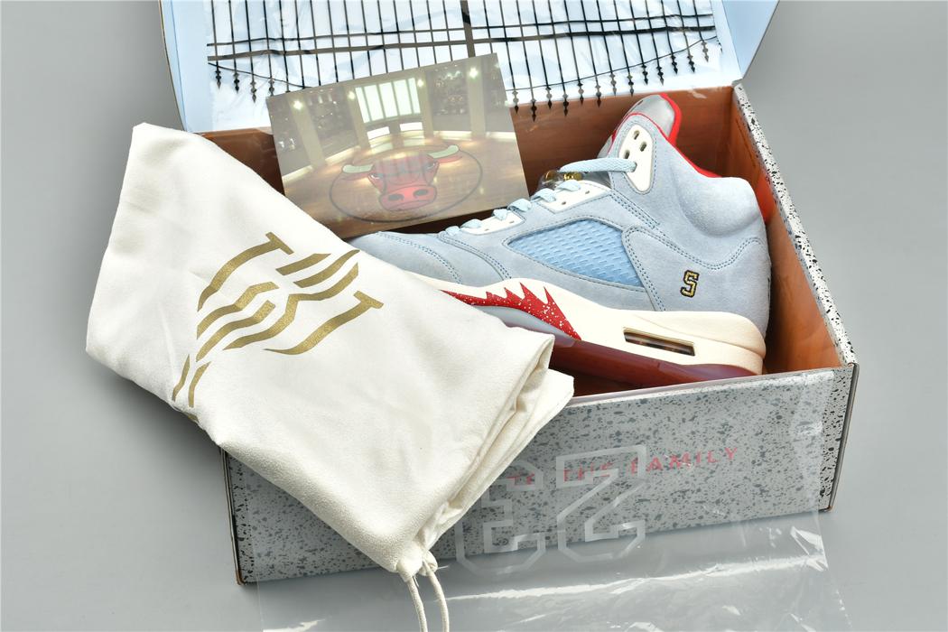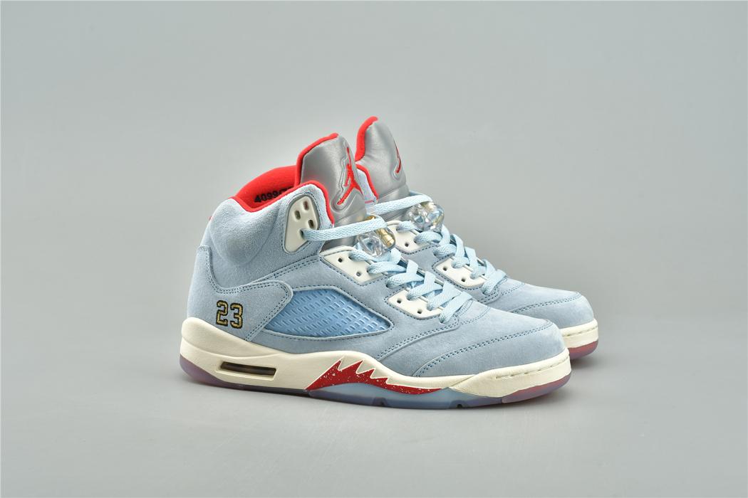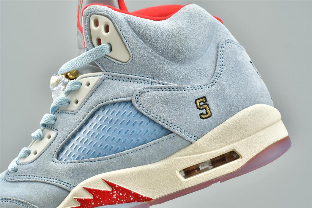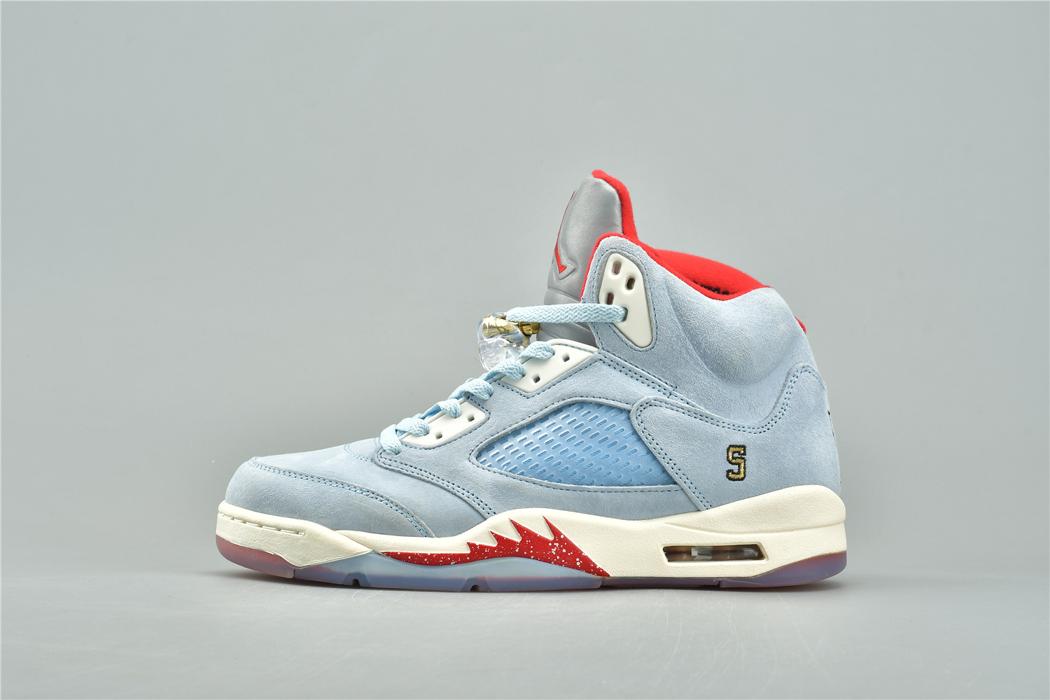 Кроссовки Trophy Room x Air Jordan 5 Ретро вдохновлены реальной комнатой трофеев в доме семьи Джордан. Издание Ice Blue изобилует замшевым верхом, вставками в расцветках University Red и Sail и замком из металлического золота. По бокам вышиты золотыми цифрами - «23» и «5» - номера на майках, которые носил М.Д. и его сын Маркус. Ниже на полупрозрачной резиновой подошве кроссовка изображен рисунок из древесины, напоминающий пол в стиле трофейной комнаты MJ. Всего в мае 2019 года было выпущено 7000 пар, каждая из которых пронумерована по отдельности. Продаются в розницу за 200 долларов.- Цвета: Ice Blue/Sail-Metallic Gold-University Red