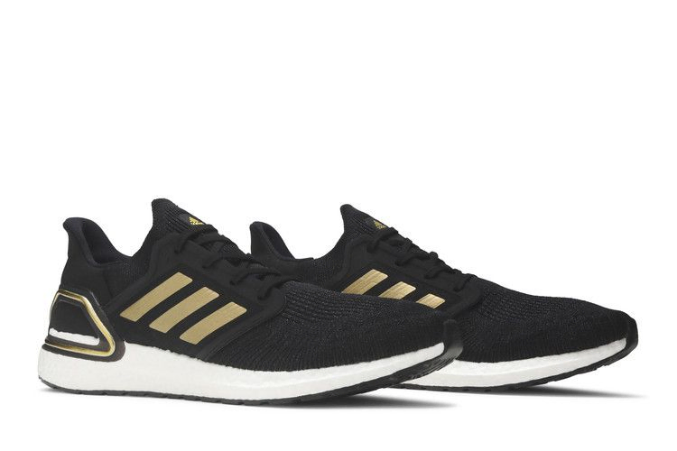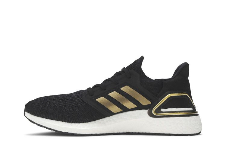 Модель UltraBoost 2020 "Gold Metallic" выполнена в простой двухцветной гамме и обладает на 20% большей амортизацией Boost по сравнению с оригинальной моделью UltraBoost. Дышащий верх из материала Primeknit выполнен в базовом черном цвете и украшен контрастными золотистыми металлическими полосками на фирменных трех полосках и 3D-клетке, которая придает устойчивость пятке из мягкого эластана. В подошве Stretchweb используется резина Continental для оптимального сцепления.