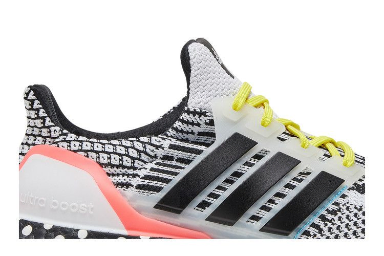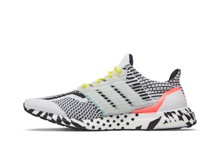 Модель adidas UltraBoost 5.0 DNA "White Black" демонстрирует несовпадающие принты на внешней стороне кроссовок. Желтые шнурки фиксируют черно-белый верх из материала Primeknit, состоящего из смеси 50/50 пластика Parley Ocean Plastic и переработанного полиэстера. Воздушная конструкция укреплена формованной средней частью стопы, украшенной черными полосками на боковой стороне, и внешней стойкой пятки, отделанной ярким коралловым оттенком. Модель стоит на полноразмерной промежуточной подошве Boost, покрытой черно-белым горошком и искривленным клетчатым принтом.