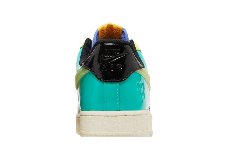 Undefeated x Nike Air Force 1 Low 'Community' празднует пару юбилеев: 20 лет Undefeated и 40 лет AF1. Верхняя часть из блестящей лакированной кожи выполнена в белом, сером, синем и бирюзовом цветах. Стелька с переменной шириной выполнена в ярком желтом цвете и контрастирует с черным язычком на пятке, украшенным тисненой эмблемой Nike Air. Дополнительные элементы брендинга включают дублирование шнурков 'UNDFTD', логотип Five Strikes на боковой пятке и тканый язычок. Низкие кроссовки установлены на белую резиновую подошву с амортизирующей подошвой Air.