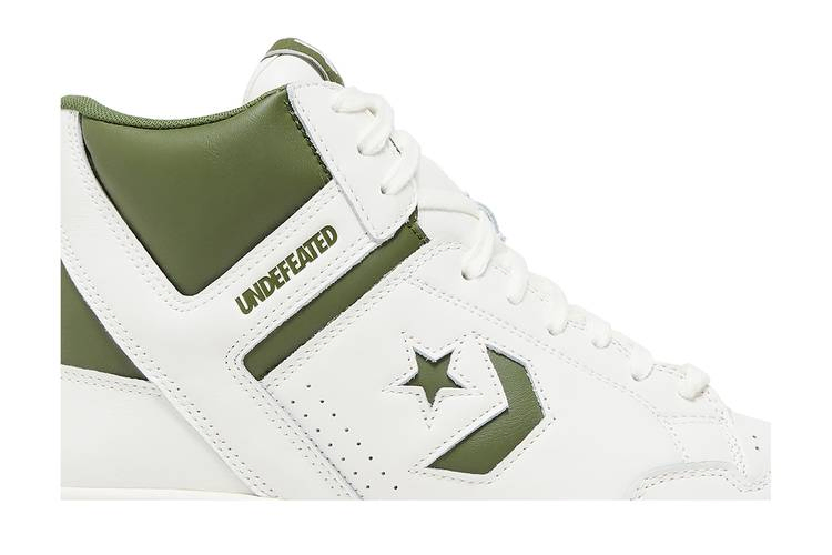 Undefeated x Converse Weapon High 'Chive' - это современная модель от лос-анджелесского ритейлера. Силуэт с высоким верхом выполнен из белой кожи с оливково-зелеными акцентами на мягком воротнике и логотипе Star Chevron. Надписи "Undefeated" и "Play Dirty" нанесены на боковую и медиальную Y-образную перекладину, а логотип Undefeated Five Strike украшает заднюю часть пятки и язычок. Резиновая подошва выполнена в тонком белом цвете, а на боковой стороне выбито слово Converse.