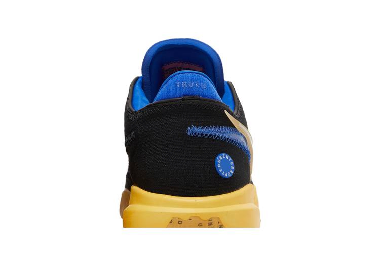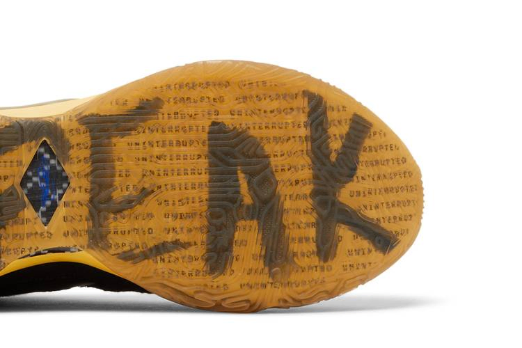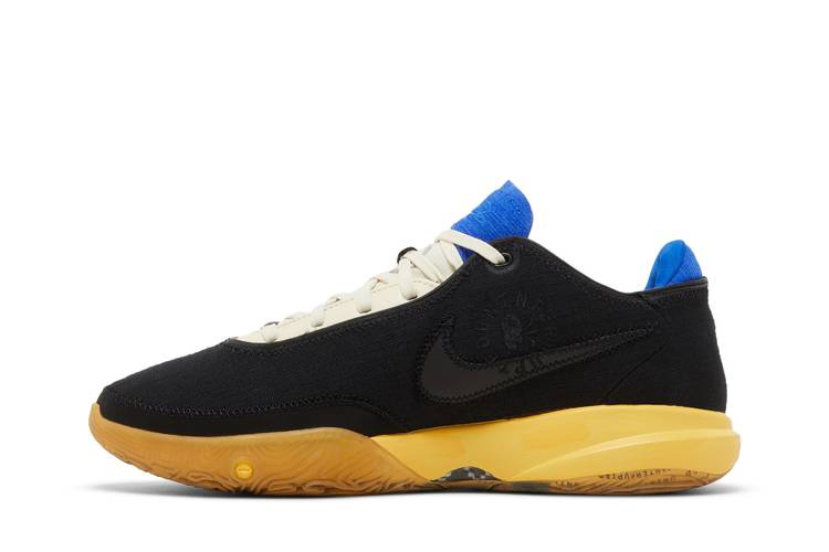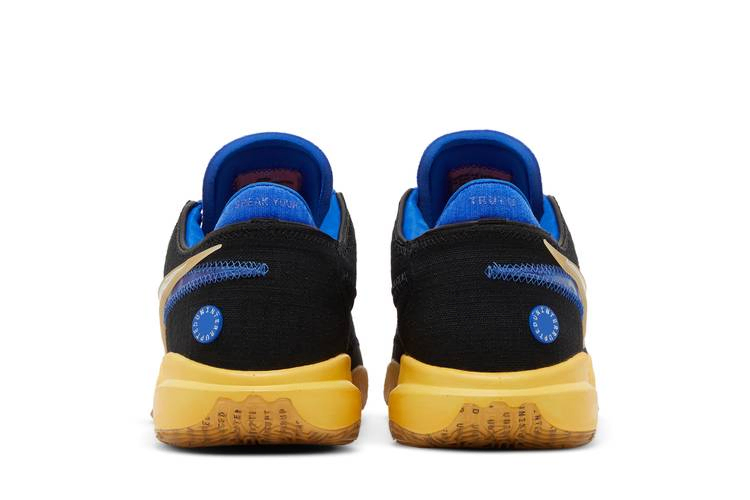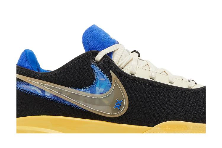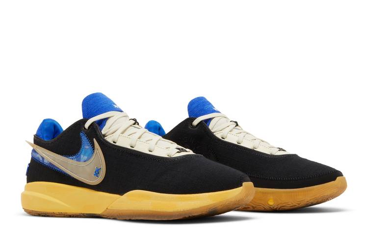 Uninterrupted x Nike LeBron 20 "Speak Your Truth" - специальная версия, разработанная в сотрудничестве с платформой Леброна Джеймса по защите прав спортсменов. Низкопрофильный силуэт выполнен из черного текстиля и украшен серым полупрозрачным логотипом Swoosh, наложенным на вторичный синий Swoosh на боковой стороне. Соответствующие оттенки королевского синего расположены на язычке, внутренней подкладке и значке Uninterrupted на боковой пятке. Промежуточная подошва Cushlon, выполненная в золотистом цвете Topaz Gold, содержит пластину из углеродного волокна и амортизацию Zoom Air в носочной и пяточной частях.- Артикул: FN0941-001
