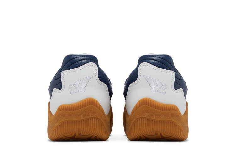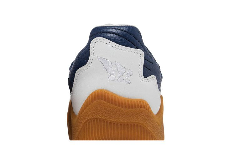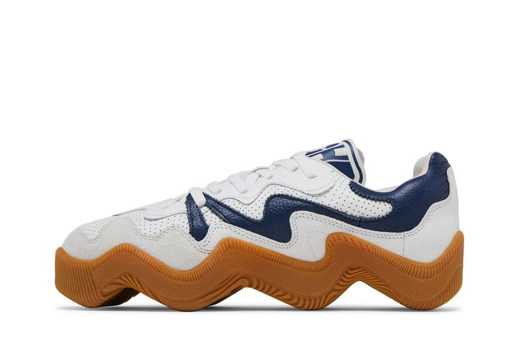 Модель MSCHF V2 Wav 'White Cream Navy' представляет собой искаженную версию классической футбольной обуви от бруклинской творческой студии. Верх из белой кожи с микроперфорацией и контрастными темно-синими акцентами. На тональном замшевом брызговике изображен волнообразный узор, который продолжается на резиновой подошве, - привлекательный дизайн, перекликающийся с силуэтом Wavy Baby 2023 года. Брендинг MSCHF украшает язычок и подошву.- Артикул: MSCHF015