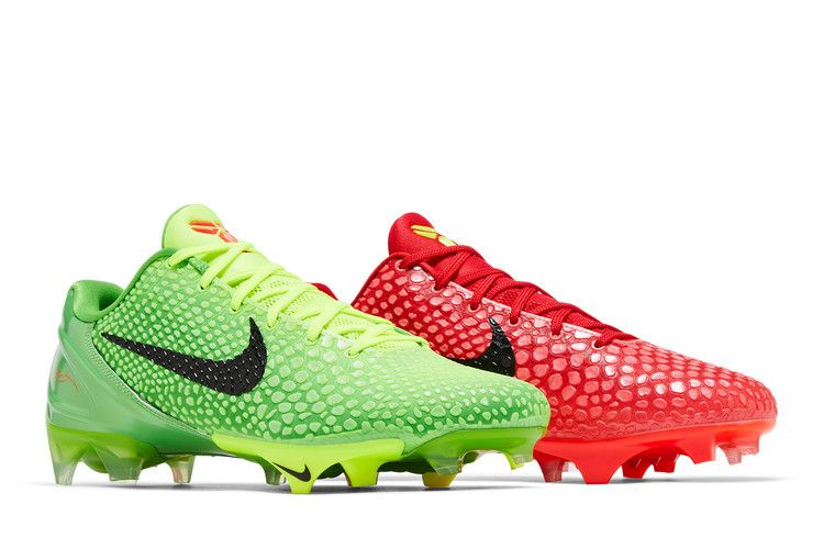 Nike Vapor Edge Kobe 6 "Grinch - Mismatch" привносит рождественские оттенки в футбольные бутсы, созданные на основе шестой фирменной обуви Коби Брайанта. Вдохновленный культовыми цветами "Grinch" и "Reverse Grinch", обтекаемый силуэт имеет асимметричную расцветку, подчеркнутую ярким зеленым цветом на правом ботинке и смелой красной отделкой на левом. Оба кроссовка украшены черным логотипом Swoosh и чешуйчатой текстурой, напоминающей о "Черной мамбе" Коби. Стелька из TPU обеспечивает устойчивость задней части стопы, а подошва с шипами - сцепление с поверхностью.