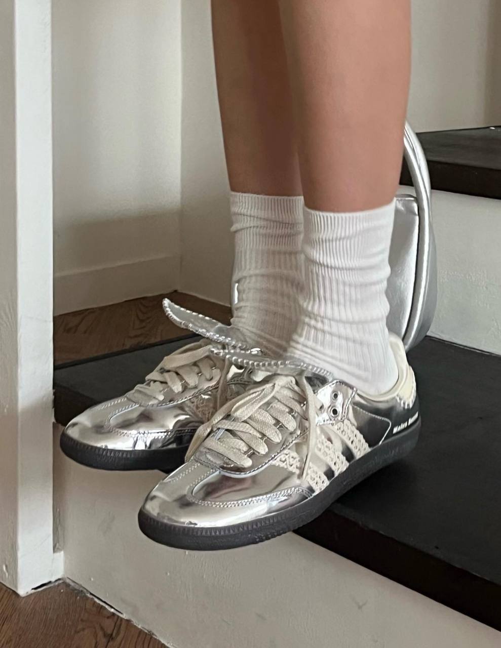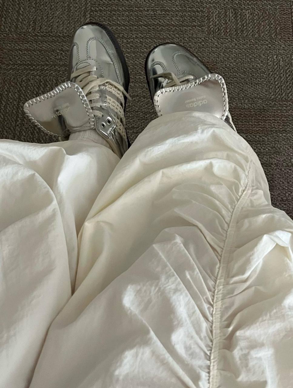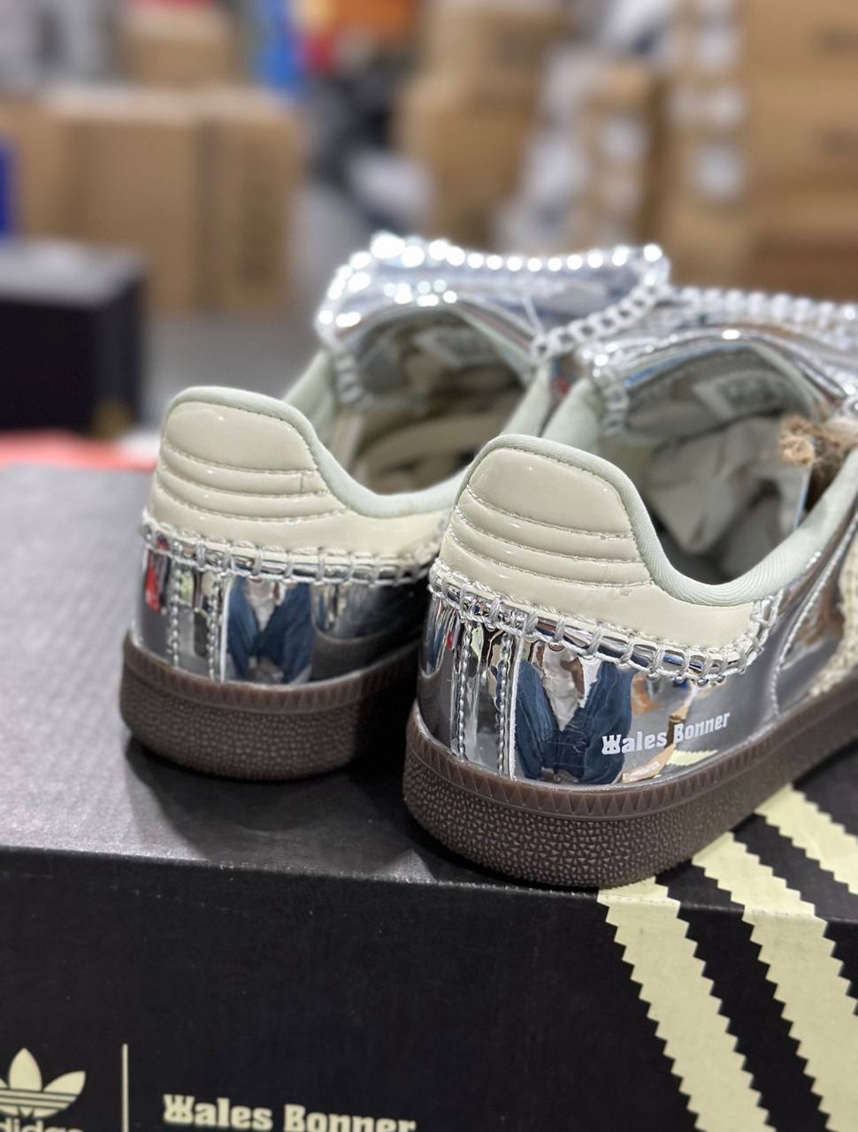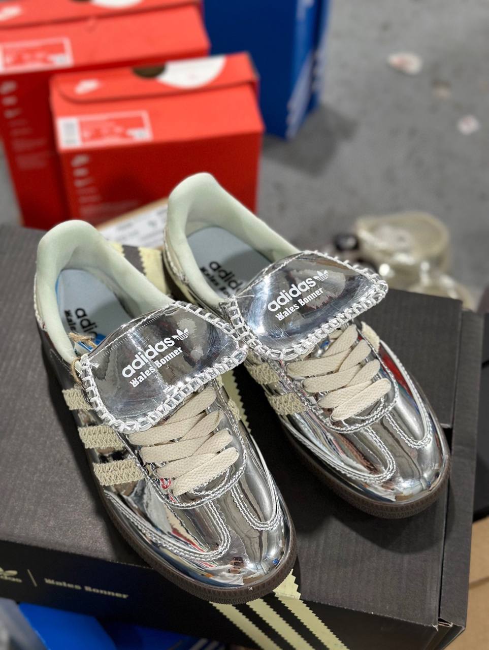Модель Wales Bonner x adidas Samba 'Silver Metallic', выпущенная в рамках капсульной коллекции, пропитанной карибским наследием и спортивным стилем, отличается полированным дизайном. Верхняя часть кроссовок из натуральной кожи покрыта серебристым металлическим напылением, украшенным тремя полосками и прострочкой вдоль язычка на пятке. Удлиненный откидной язычок украшен двойным брендингом, а логотип Wales Bonner нанесен на боковую часть пятки. Коричневая резиновая подошва поддерживает обтекаемый силуэт.- Цвета: Silver Metallic/Cream White/Grey One