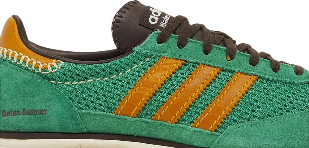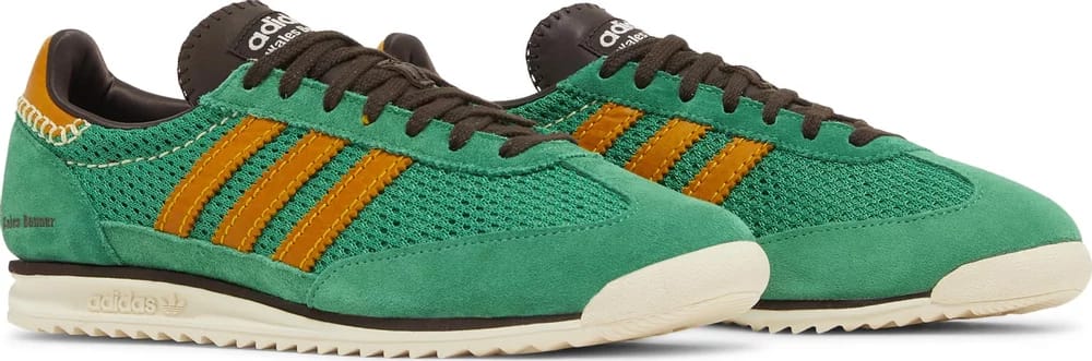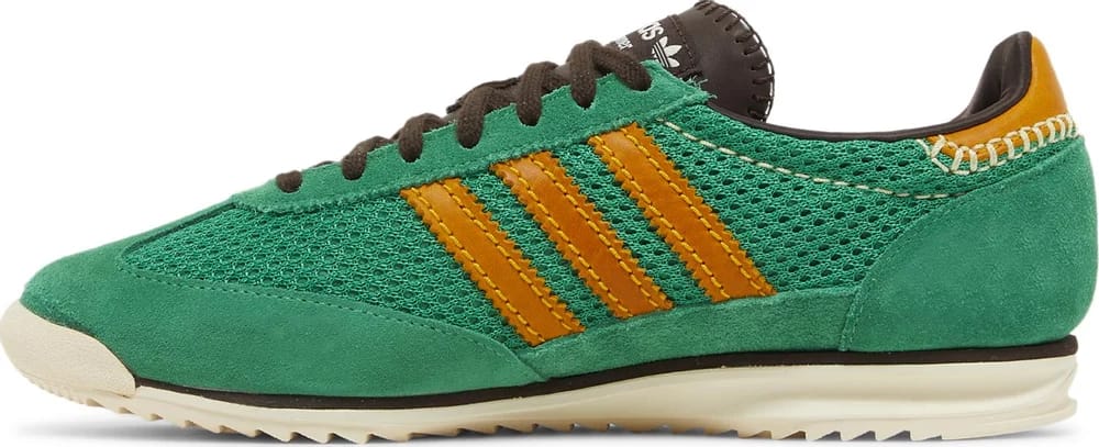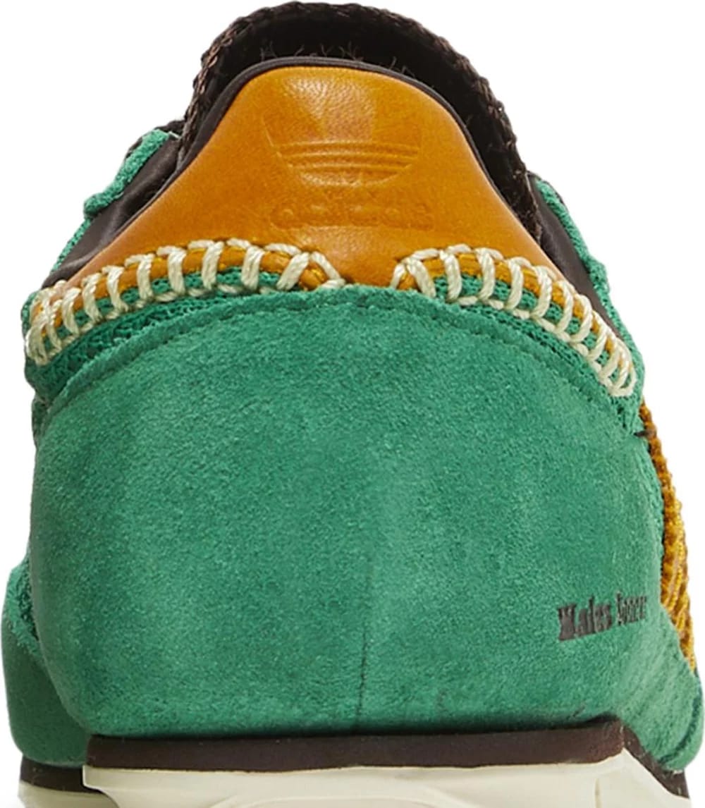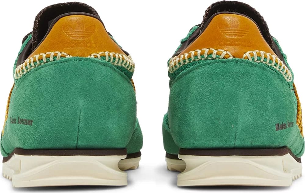 Wales Bonner x adidas SL72 Knit Green - это результат сотрудничества между британским дизайнером Джонатаном Уэйлсом Боннером и немецким спортивным брендом adidas. Кроссовки выполнены в классическом силуэте SL72, но с добавлением современных деталей. Верх кроссовок выполнен из вязаного материала цвета «Team Green», который обеспечивает комфорт и поддержку стопы. На пятке и мидсоле расположены кожаные детали цвета «Collegiate Gold», которые добавляют контраста и элегантности.